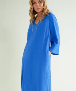 Abito in lino viscosa dalla linea dritta con spacchi laterali. Scollo a V, tasche a fessura inserite nel taglio fianco, maniche con lunghezza a tre quarti.