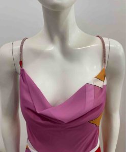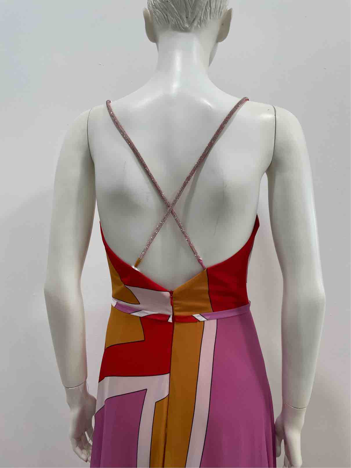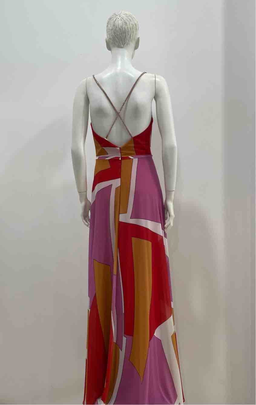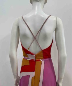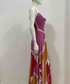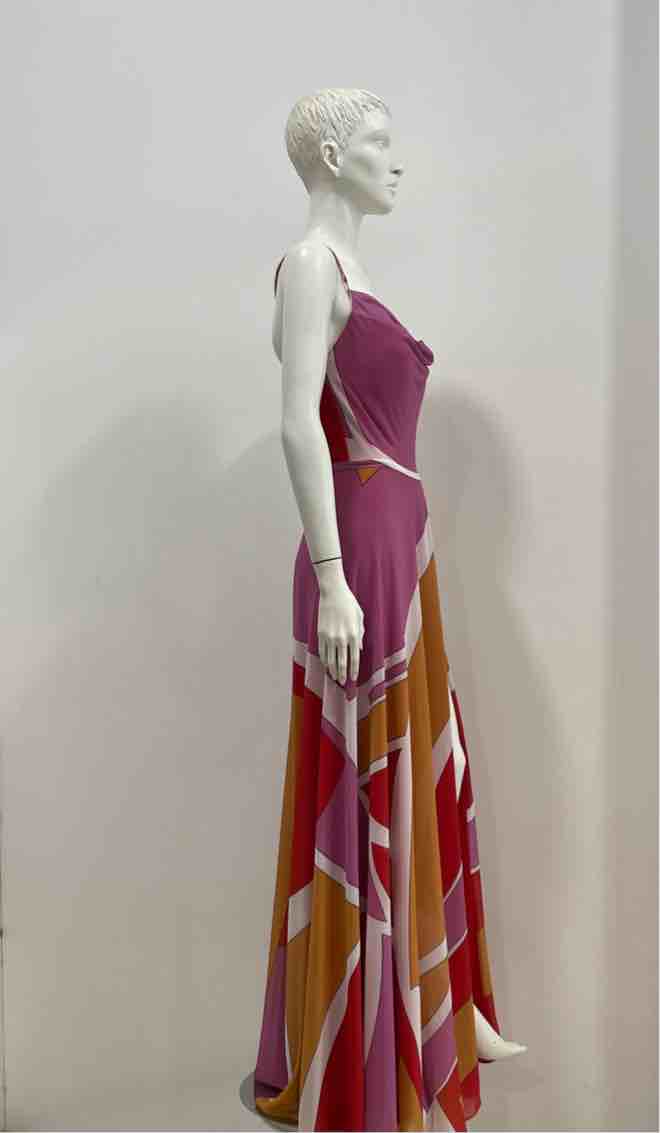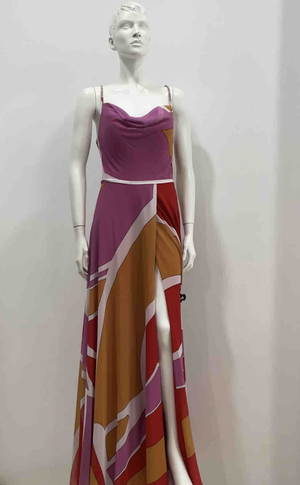 • Abito lungo con spacco profondo. in tessuto di chiffon a fantasia.