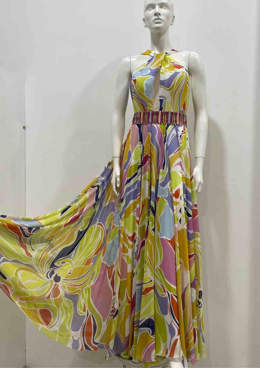 Abito lungo con stola, tessuto chiffon a fantasia .