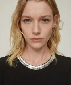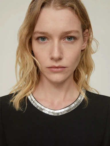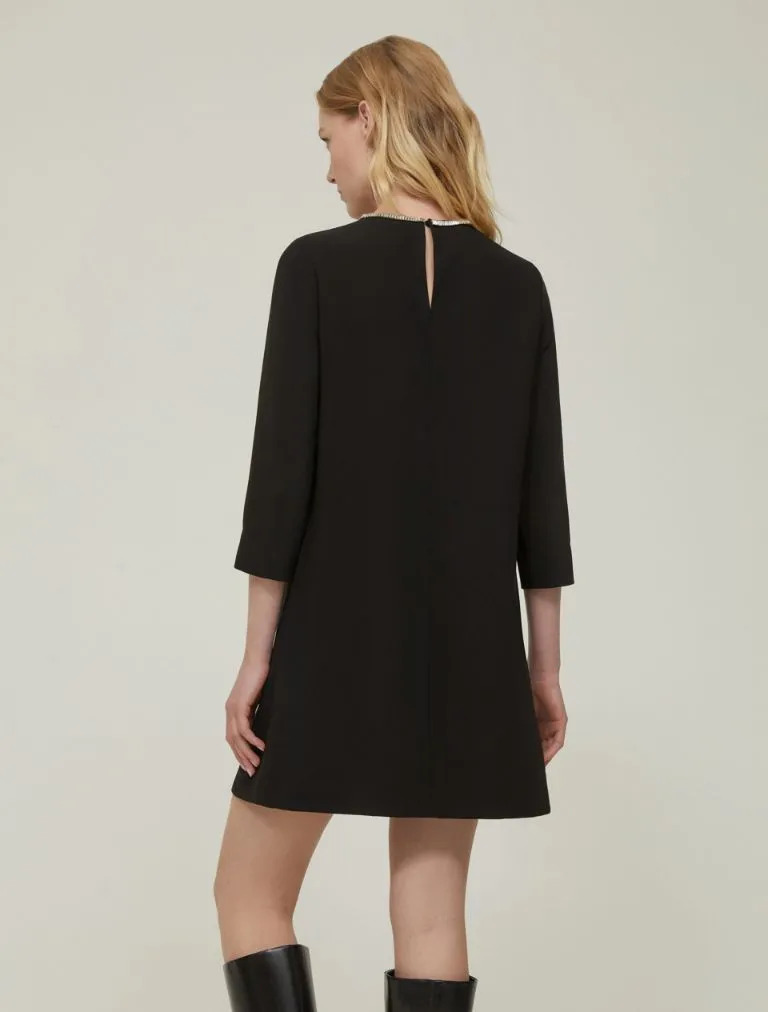 Chic assoluto: l’abito in cady varia la purezza minimal del suo design con il tocco glam di un girocollo scintillante – e il dettaglio non passerà inosservato.