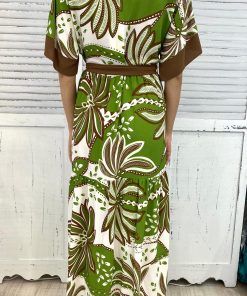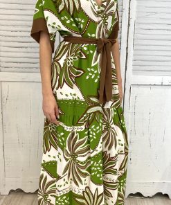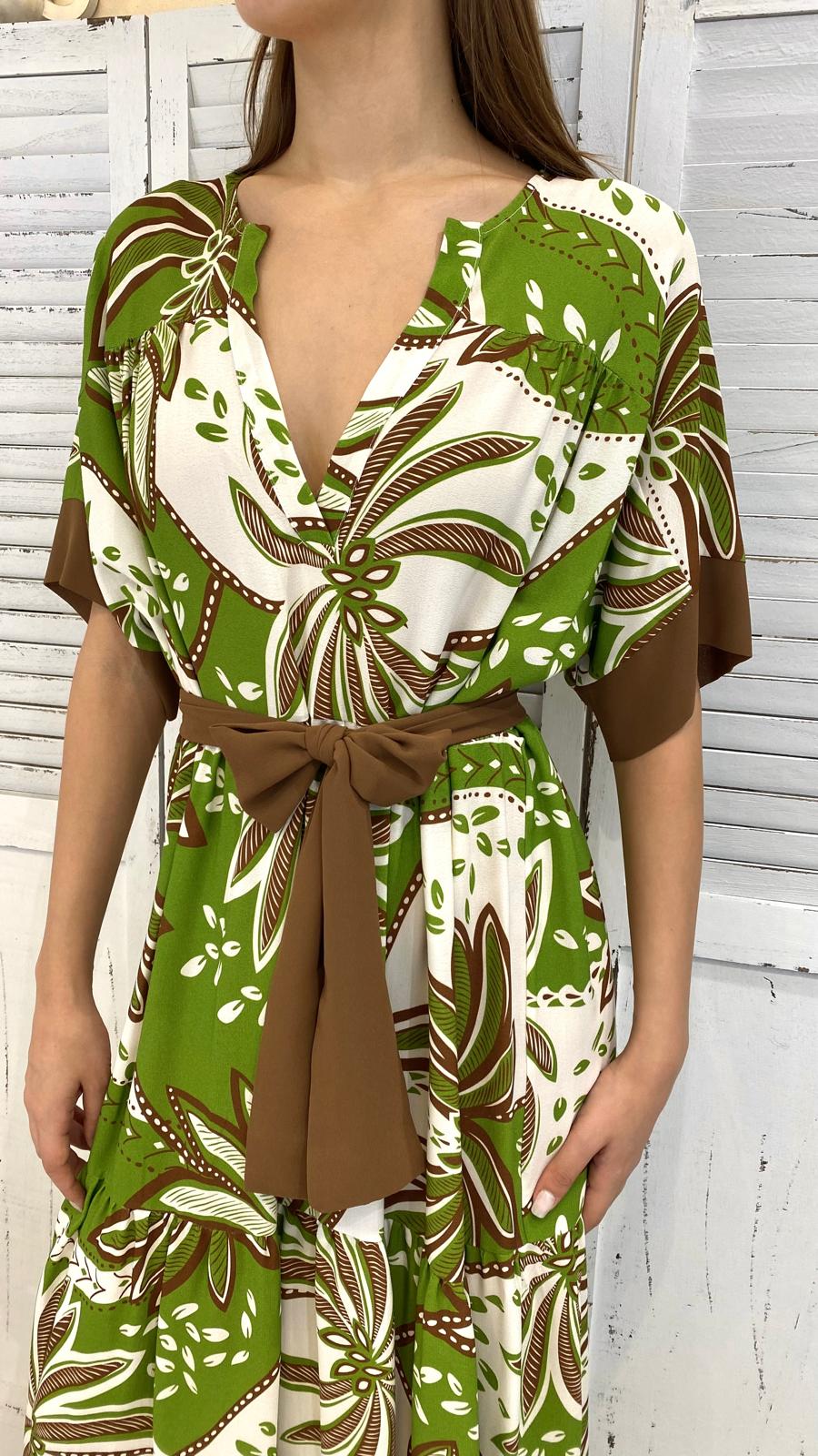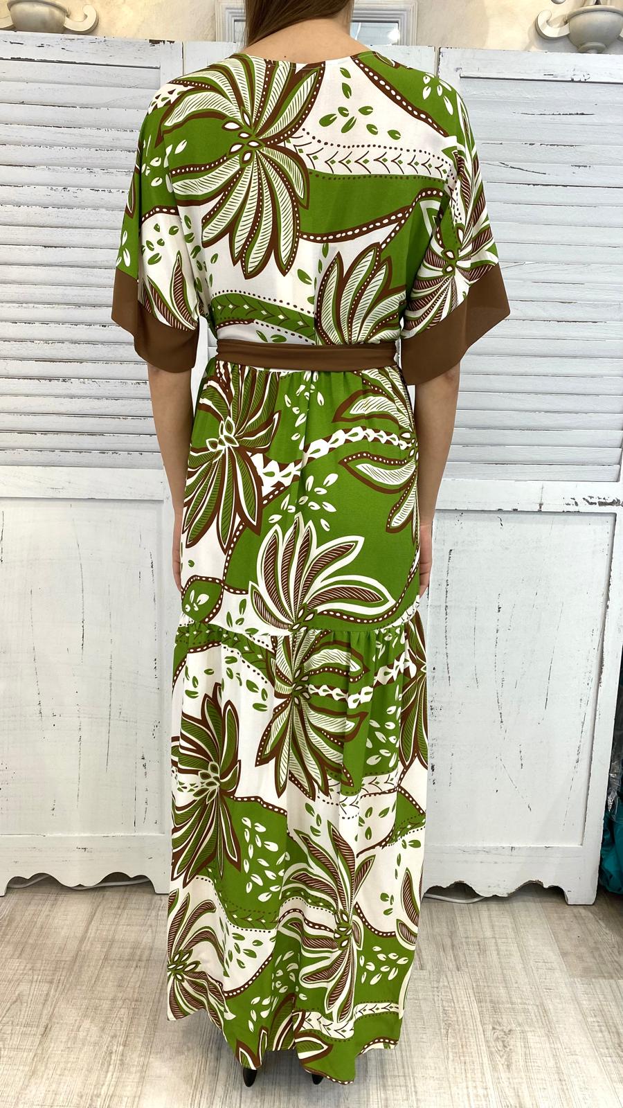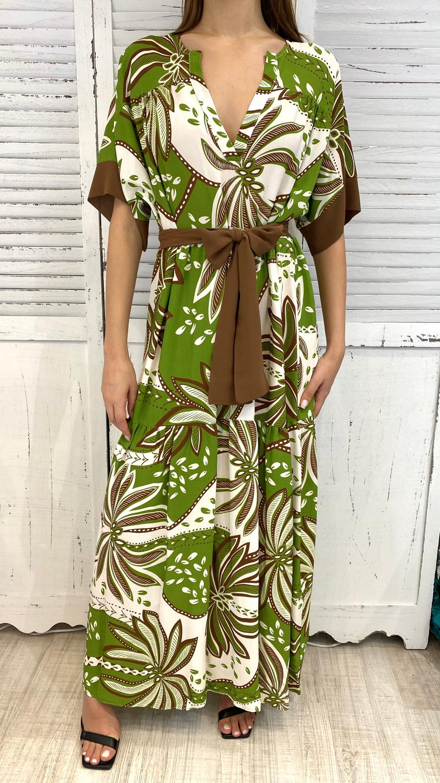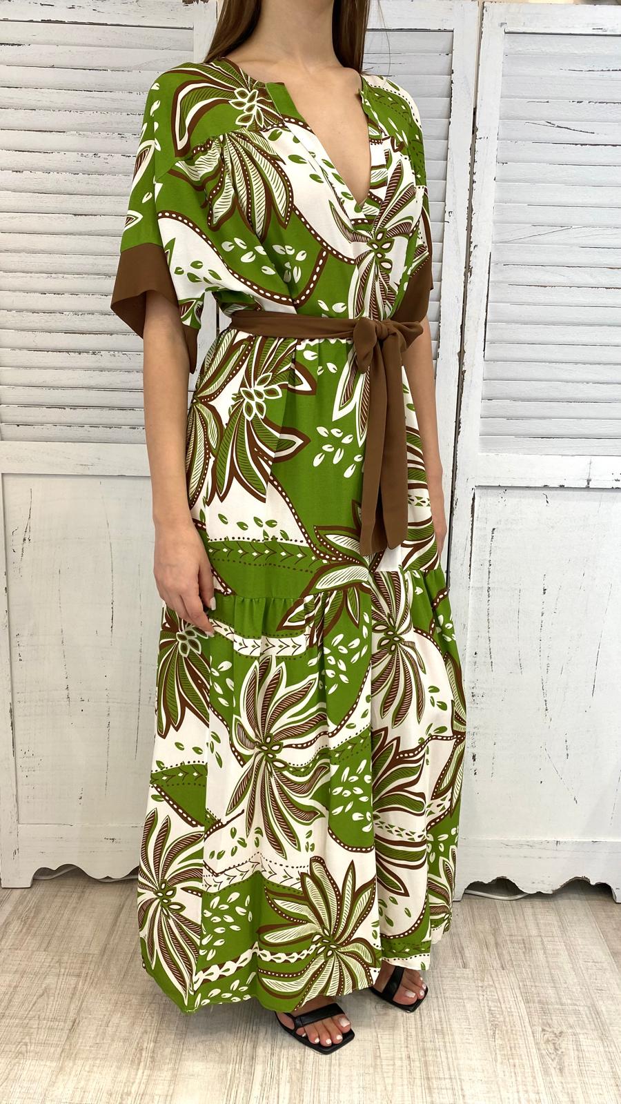 Maxi abito, a balze, maniche corte a kimono, scollo V. tessuto in viscosa con cinta coordinata.vestibilità comoda.
