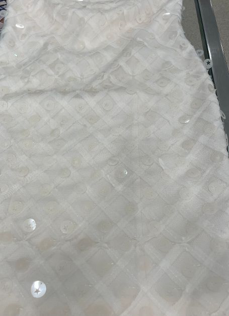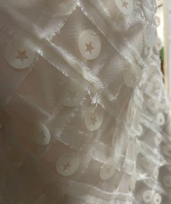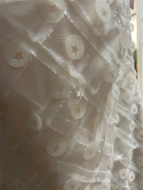 • con applicazioni paillettes circolari tono su tono e ricamo in tulle solo sul davanti.