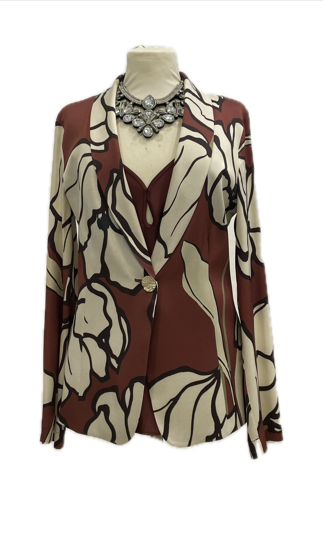 Versatile, questo blazer destrutturato in doppio raso si indossa nelle sue linee fluide, in coordinato per le occasioni più eleganti o spezzato con capi informali negli outfit quotidiani.