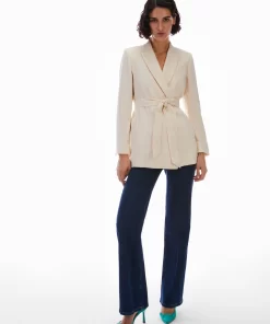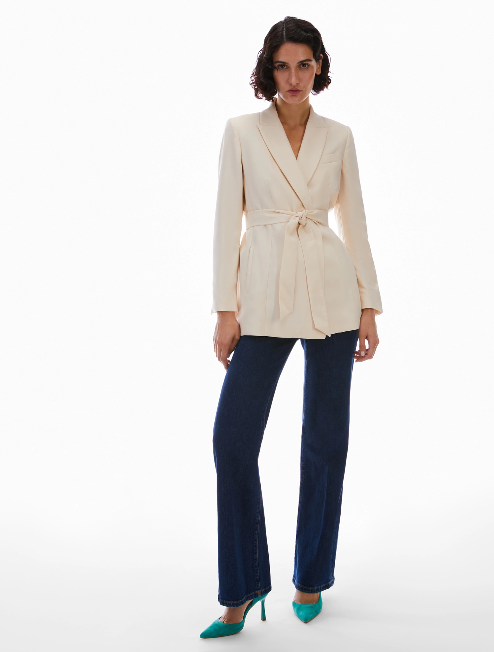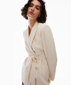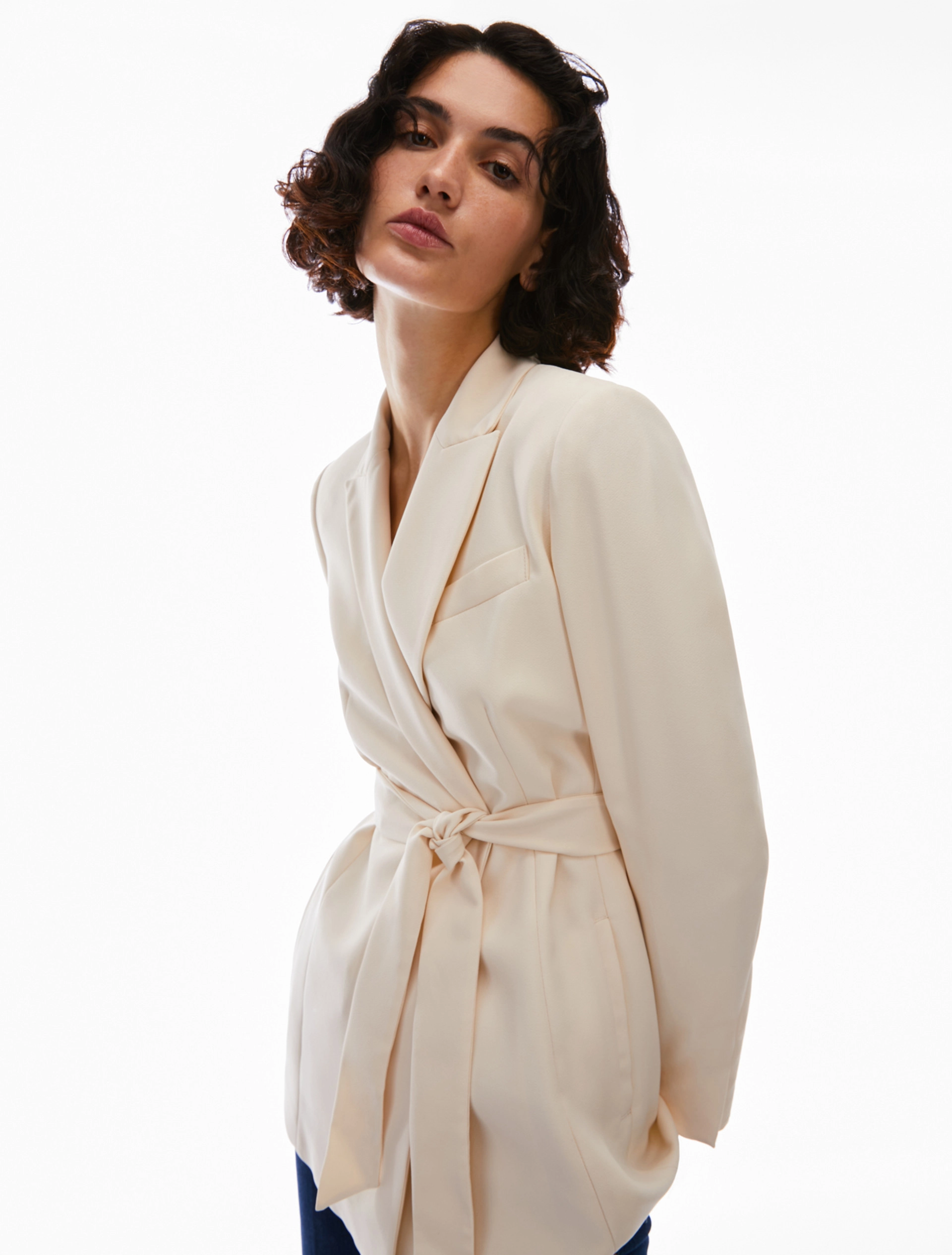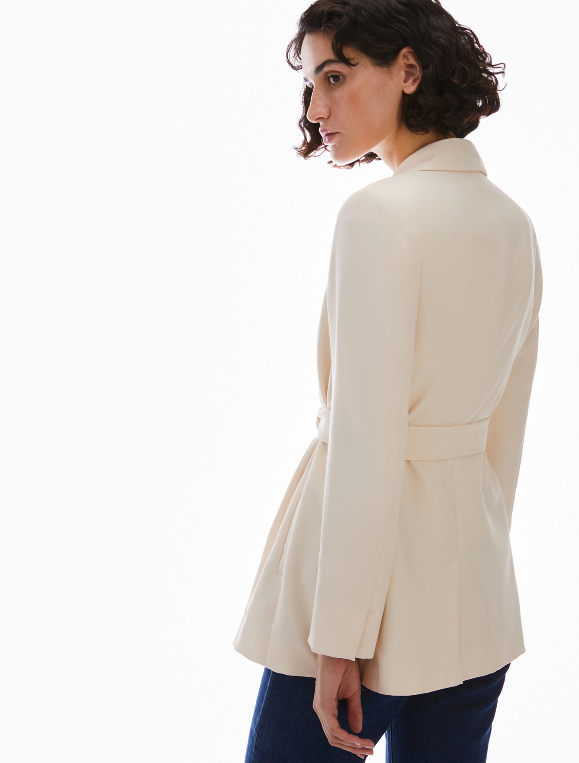 Blazer in envers satin opaco. Senza bottoni, si indossa nella sua silhouette diritta e allungata o stretto in vita con la cintura abbinata. Revers a lancia e tasche a filo, spacchi ai polsi e sul retro. Foderato.
