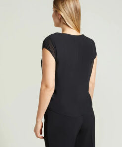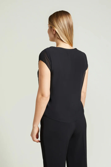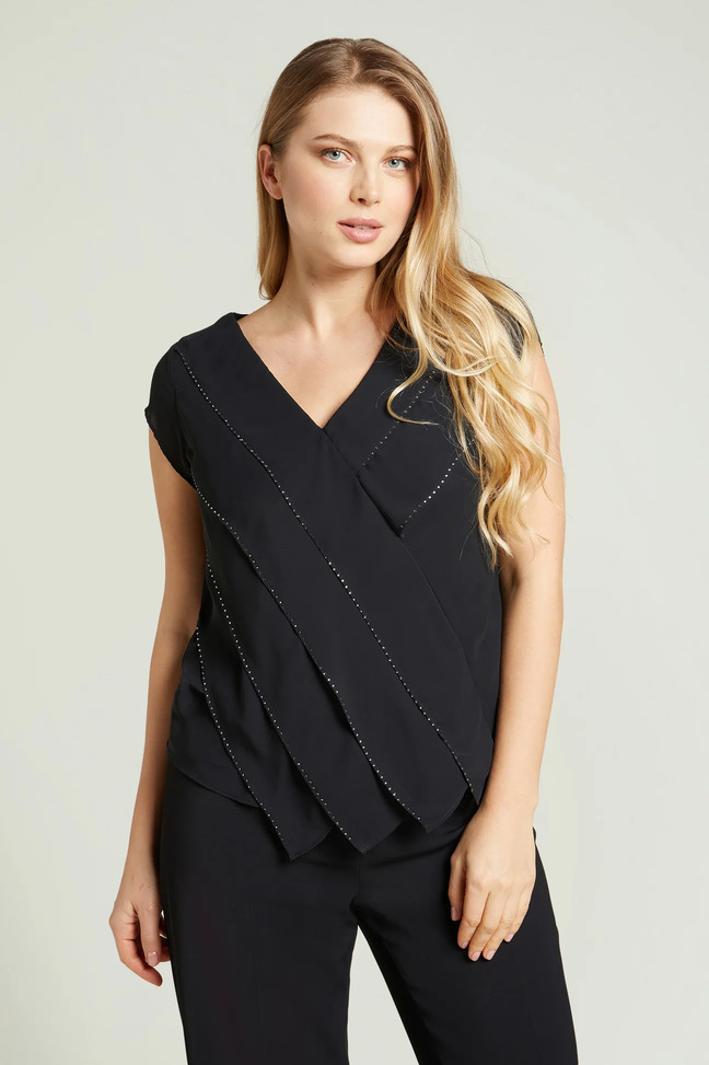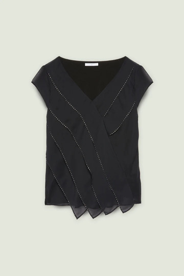 Top in georgette con scollo a “V”, caratterizzato da piccole balze asimmetriche impreziosite da punti luce. Foderato, manica corta.