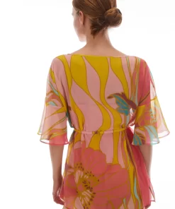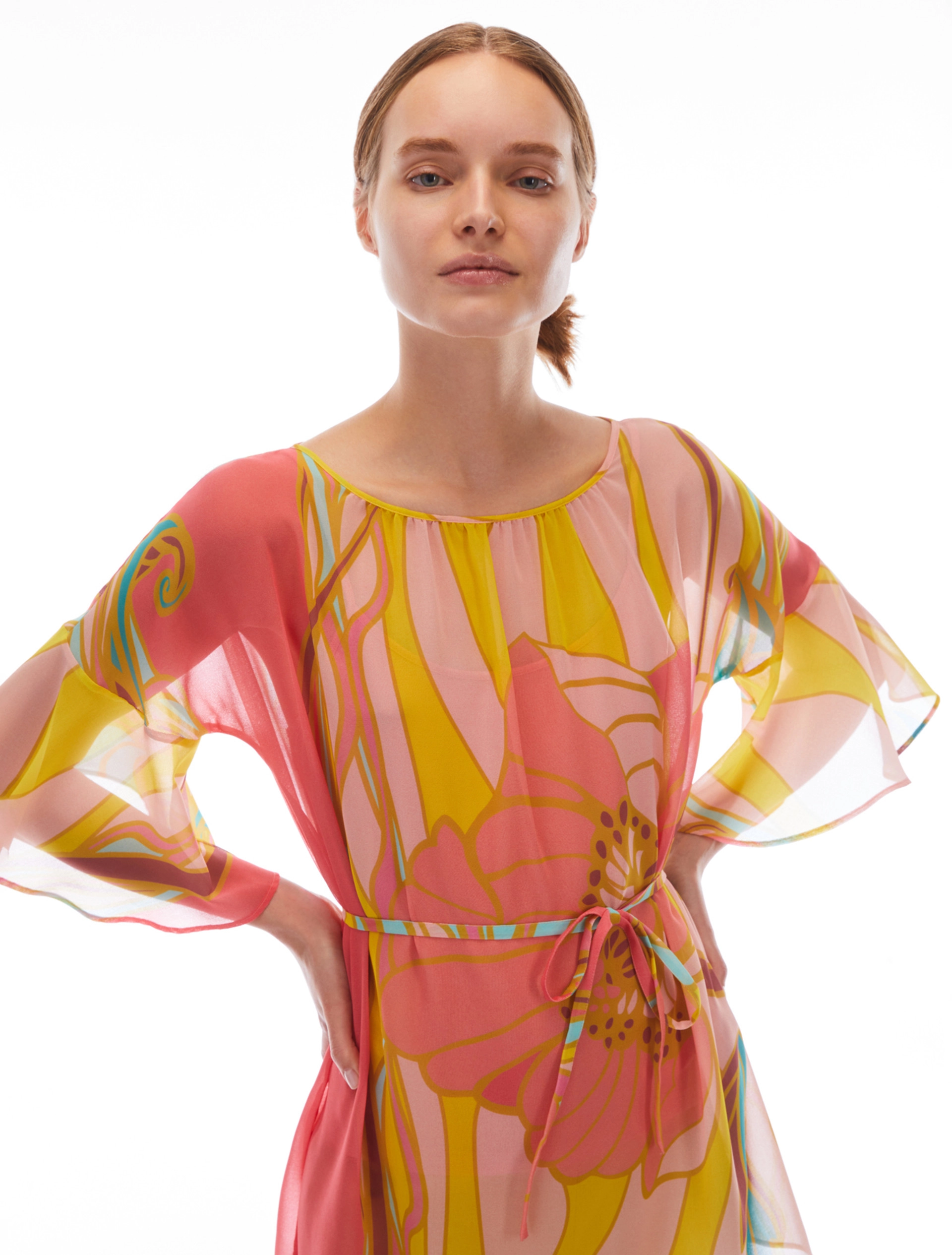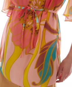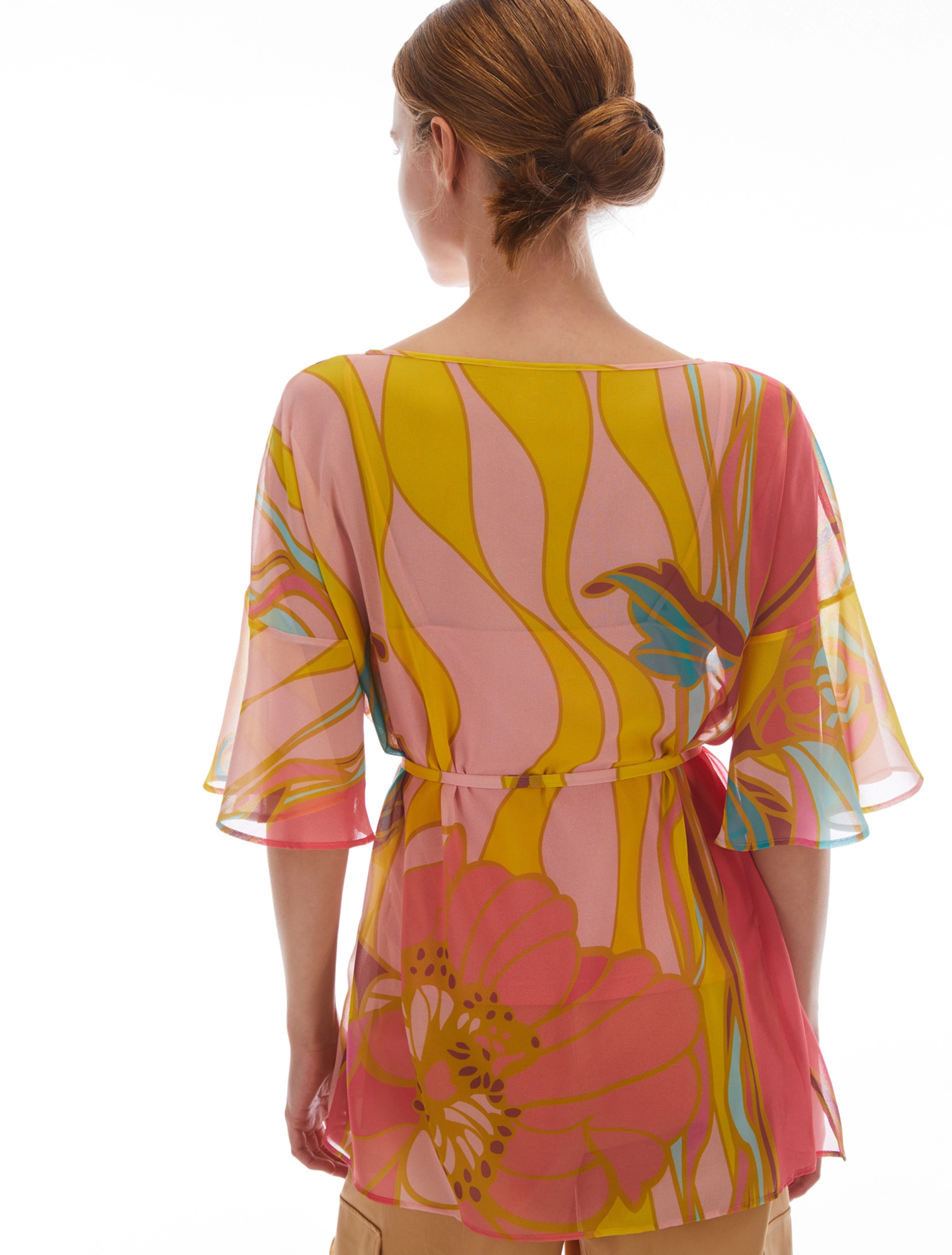 Blusa in georgette a fantasia in toni sorbetto. Ha un taglio a tunica con spacchi laterali e si accosta al corpo con la cintura abbinata. Scollo a barchetta con arricciatura sul davanti e maniche con balze ondulate. Completa di top anti-trasparenza.