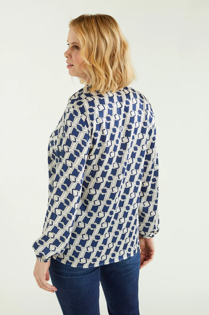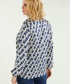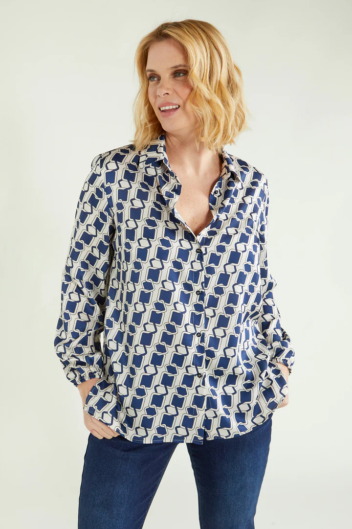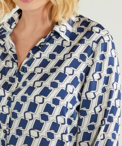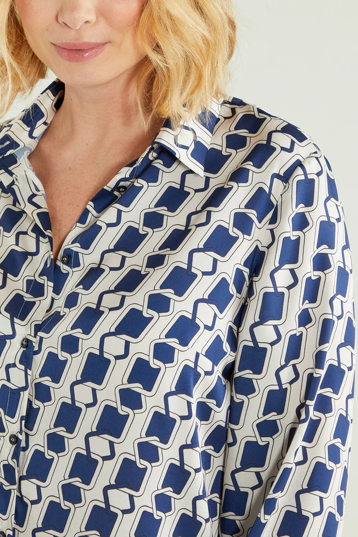 • Camicia stampata in satin. Linea diritta con spacchetti laterali.