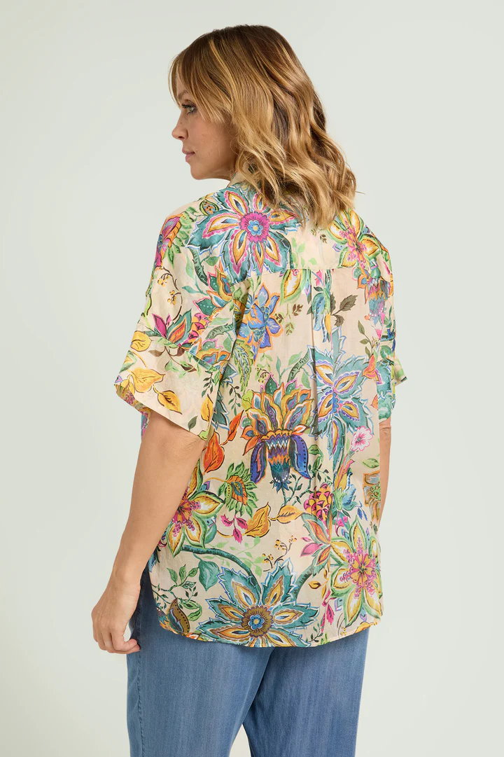 • Camicia fantasia in mussola di puro cotone dalla linea dritta con spacchi laterali.