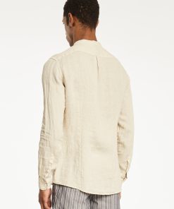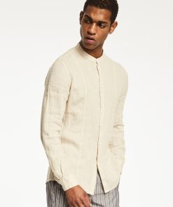 Camicia realizzata in lino con lavaggio effetto used. Il modello ha vestibilità regular, colletto alla coreana e maniche lunghe. Chiusura con bottoni.