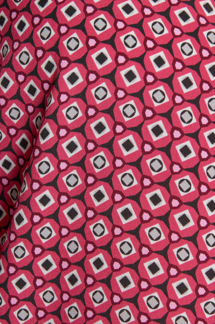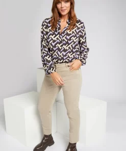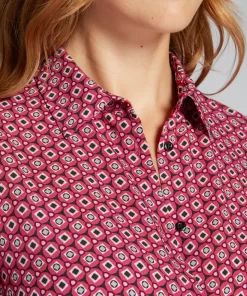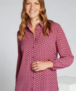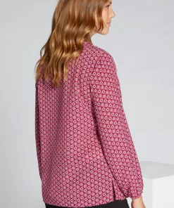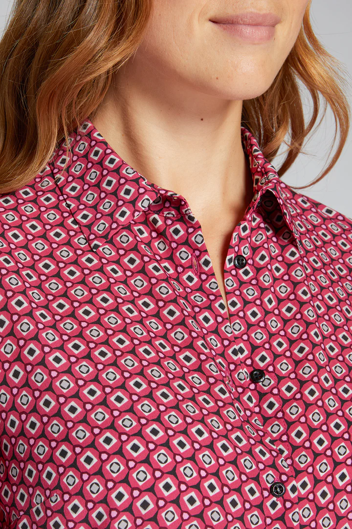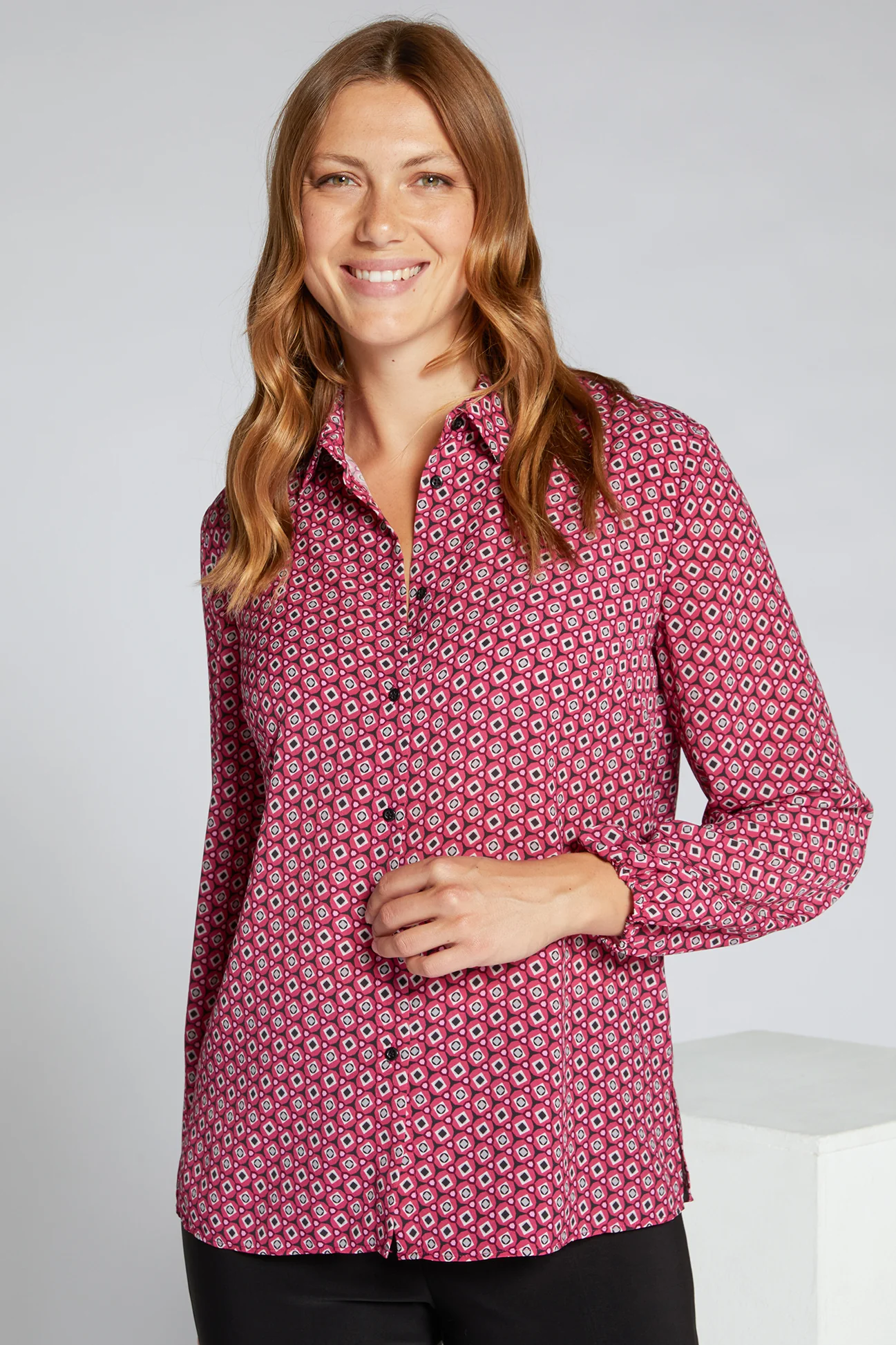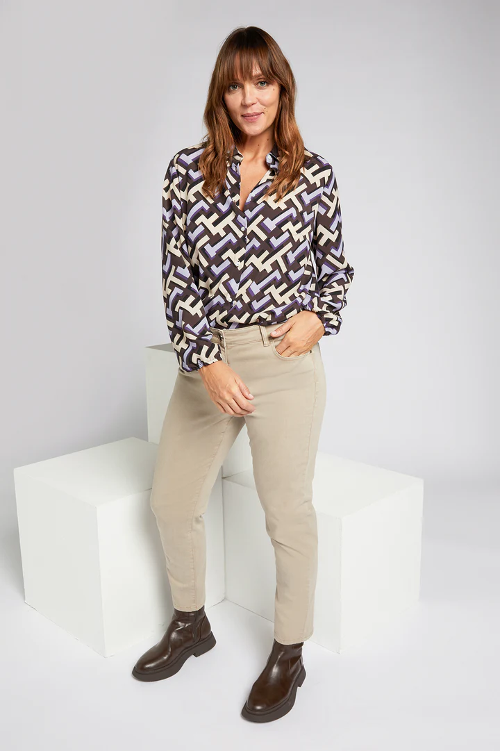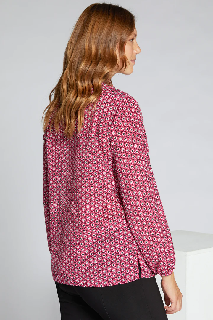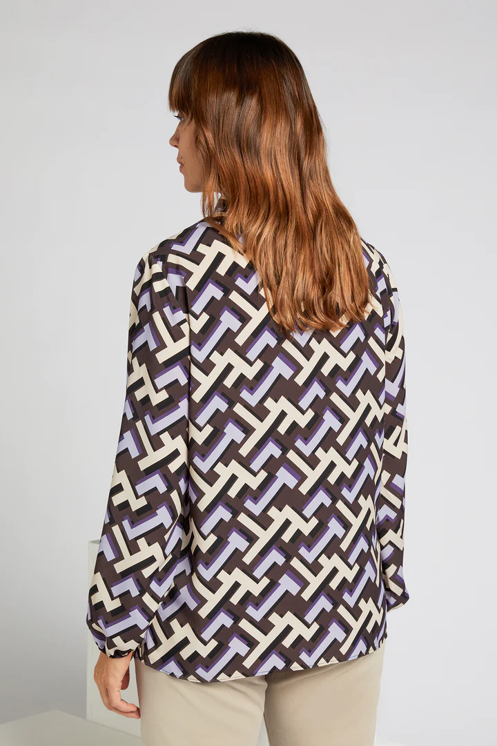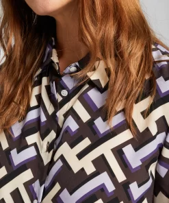 Camicia fantasia in crepe de chine, dalla linea diritta con spacchi laterali. Colletto, listino, chiusura con asole e bottoni. Manica lunga a sbuffo. Stampa esclusiva Luisa Viola.