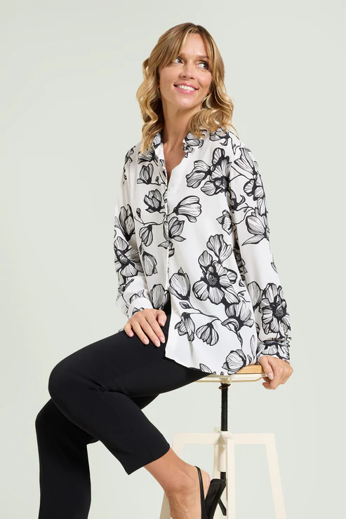 Camicia fantasia in doppia georgette. Linea dritta, colletto con listino, chiusura con bottoni, manica lunga con polso, dietro con carrè doppio e soffietto.