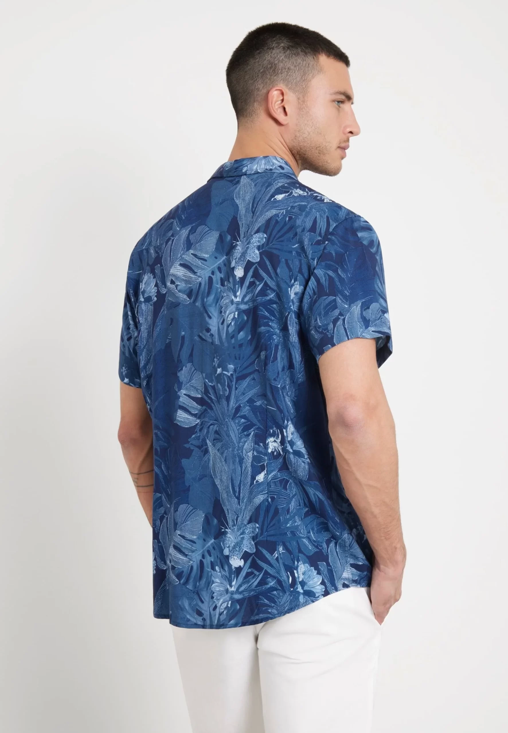Camicia mezza manica di viscosa stampata, chiusura con bottoni e colletto morbido.