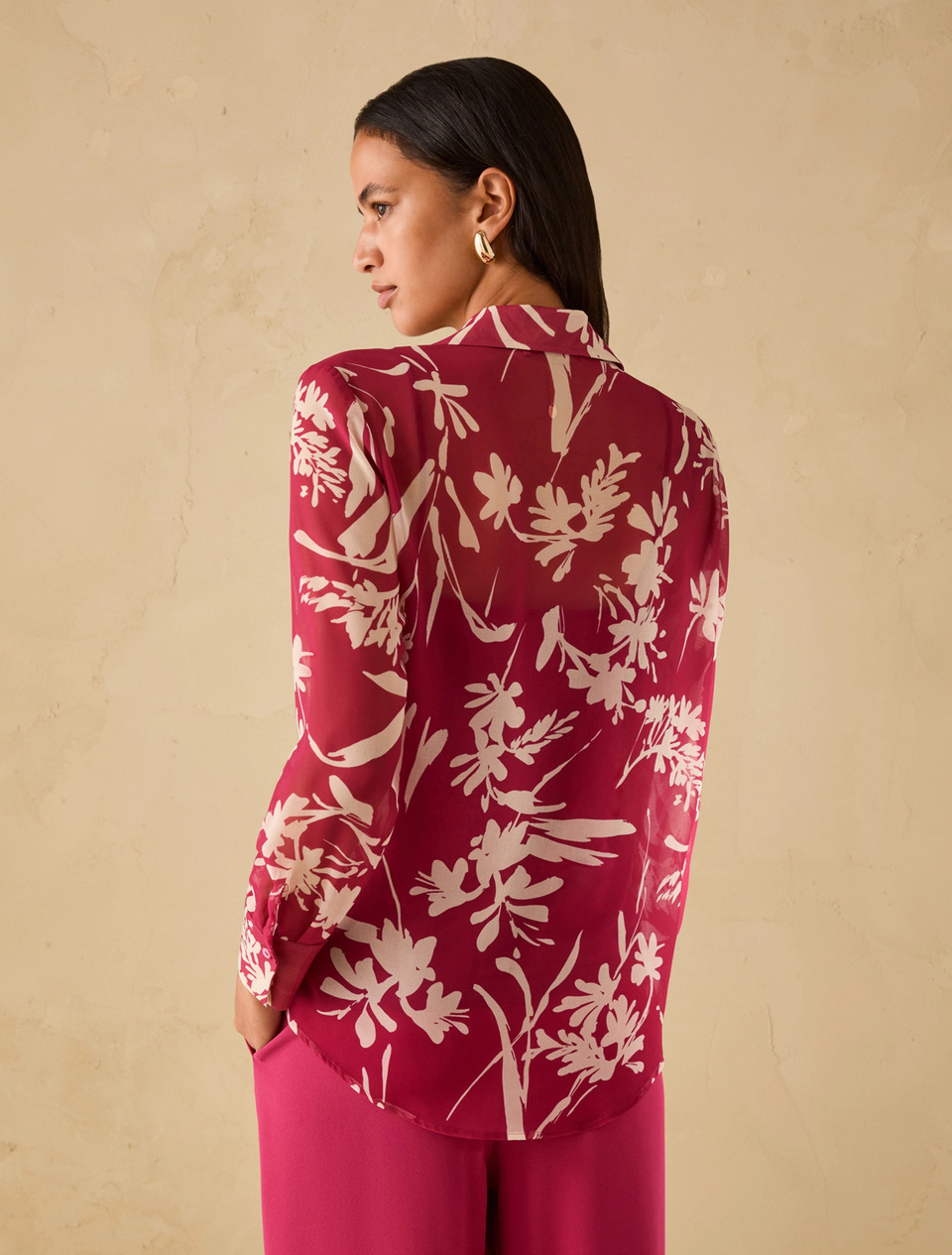 Con un taglio morbido in georgette semitrasparente, questa camicia rielabora la fantasia floreale in una moderna versione grafica: vibrante di colore, darà una svolta vivace ai look più chic.