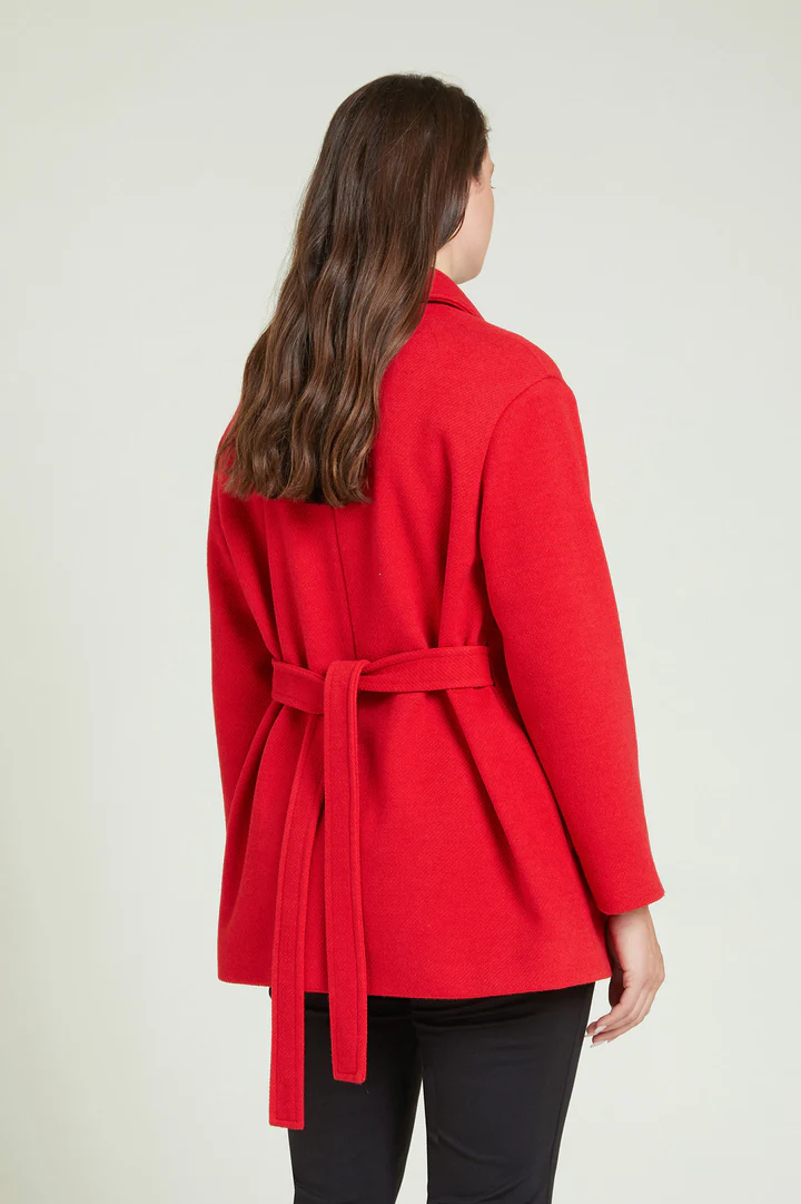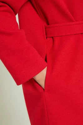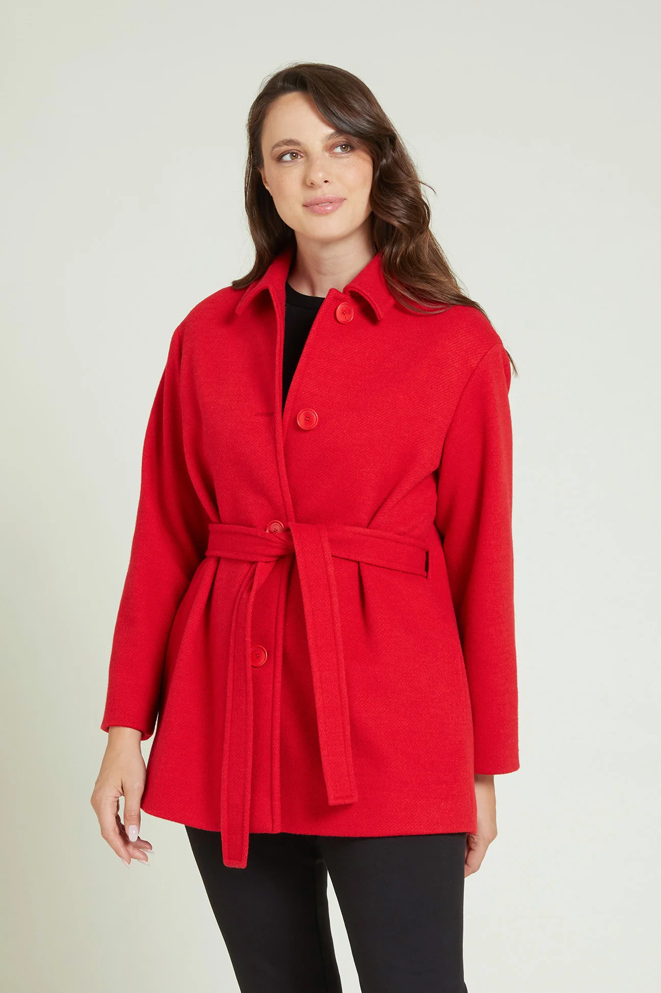• Colletto, chiusura con bottoni, tasche inserite nei fianchi, cintura.
