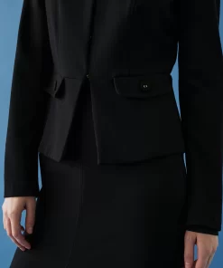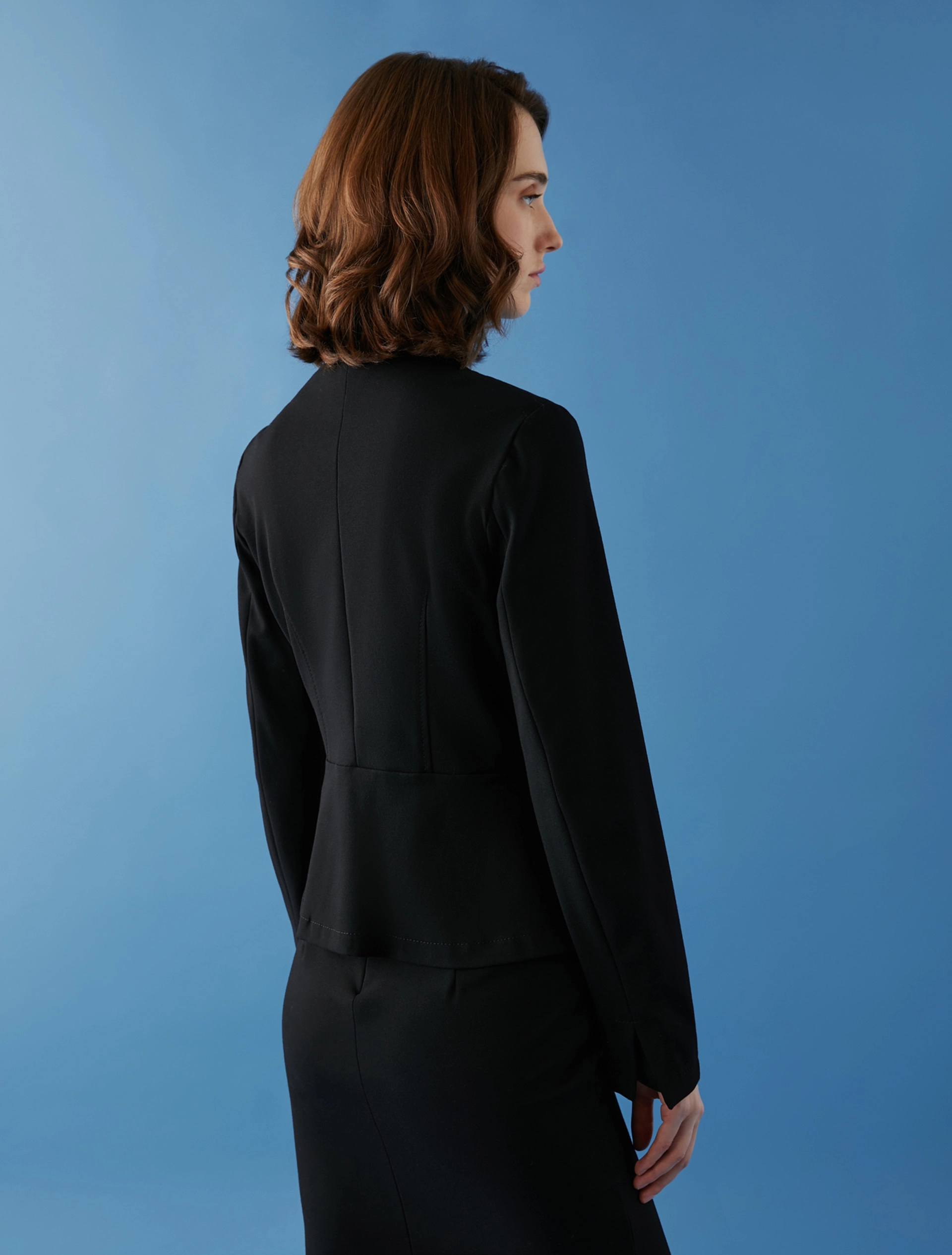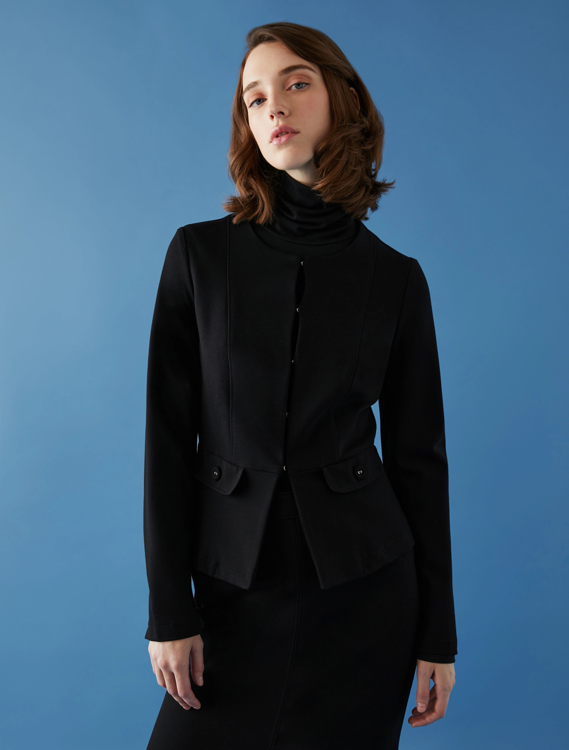 Giacca in viscosa, rifinita con lavorazione a punto Milano. Scollo rotondo, maniche a giro, baschina con patte e bottoni. Chiusura con uncinelli. Lunghezza 54 cm. Sfoderata.