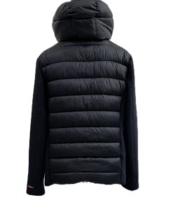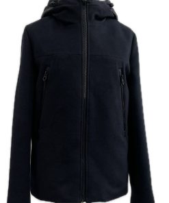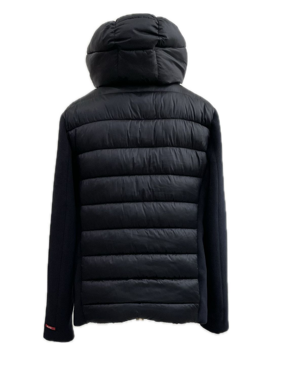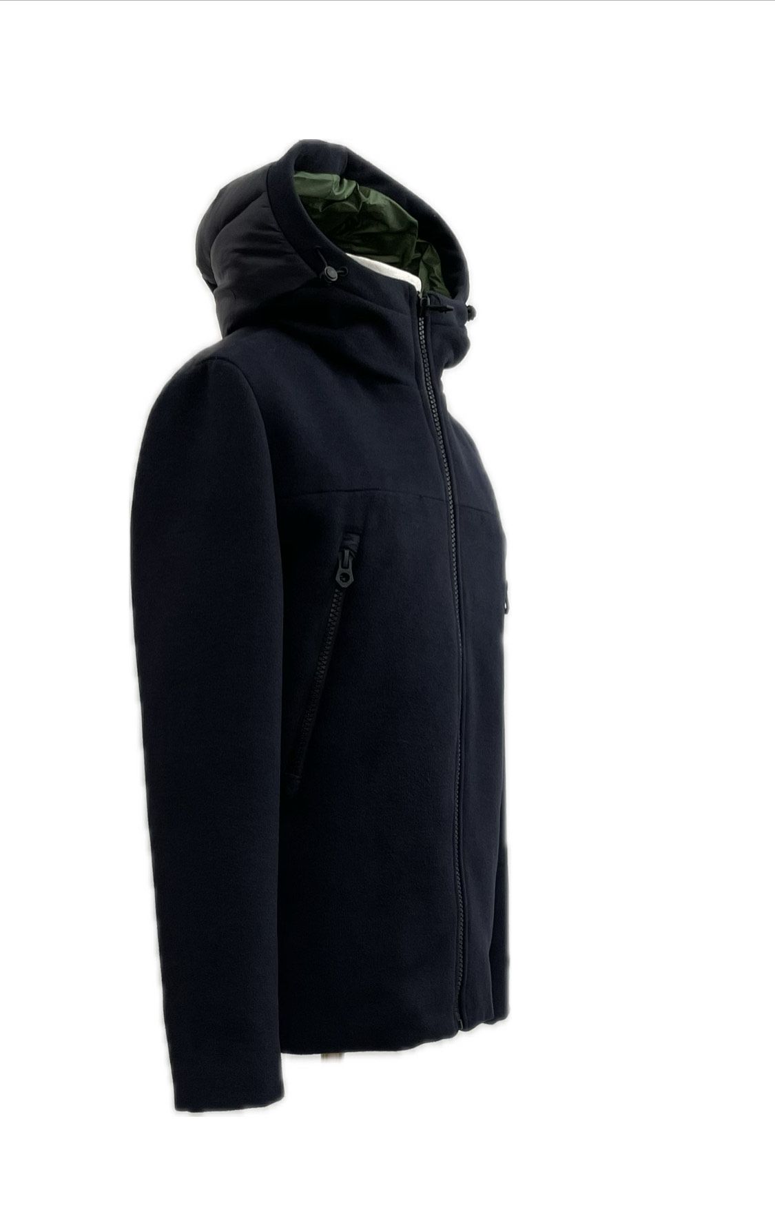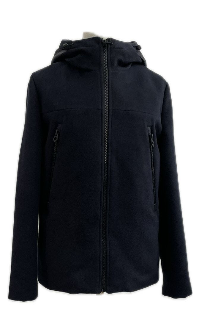 Giubbotto con cappuccio in doppio tessuto, il davanti il tessuto è in panno di lana con le zip a vista . il dietro è trapuntato e imbottito (come piumino ),a cuciture orizzontali,interno foderato color verde,tasca interna. Disponibile in blu.