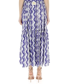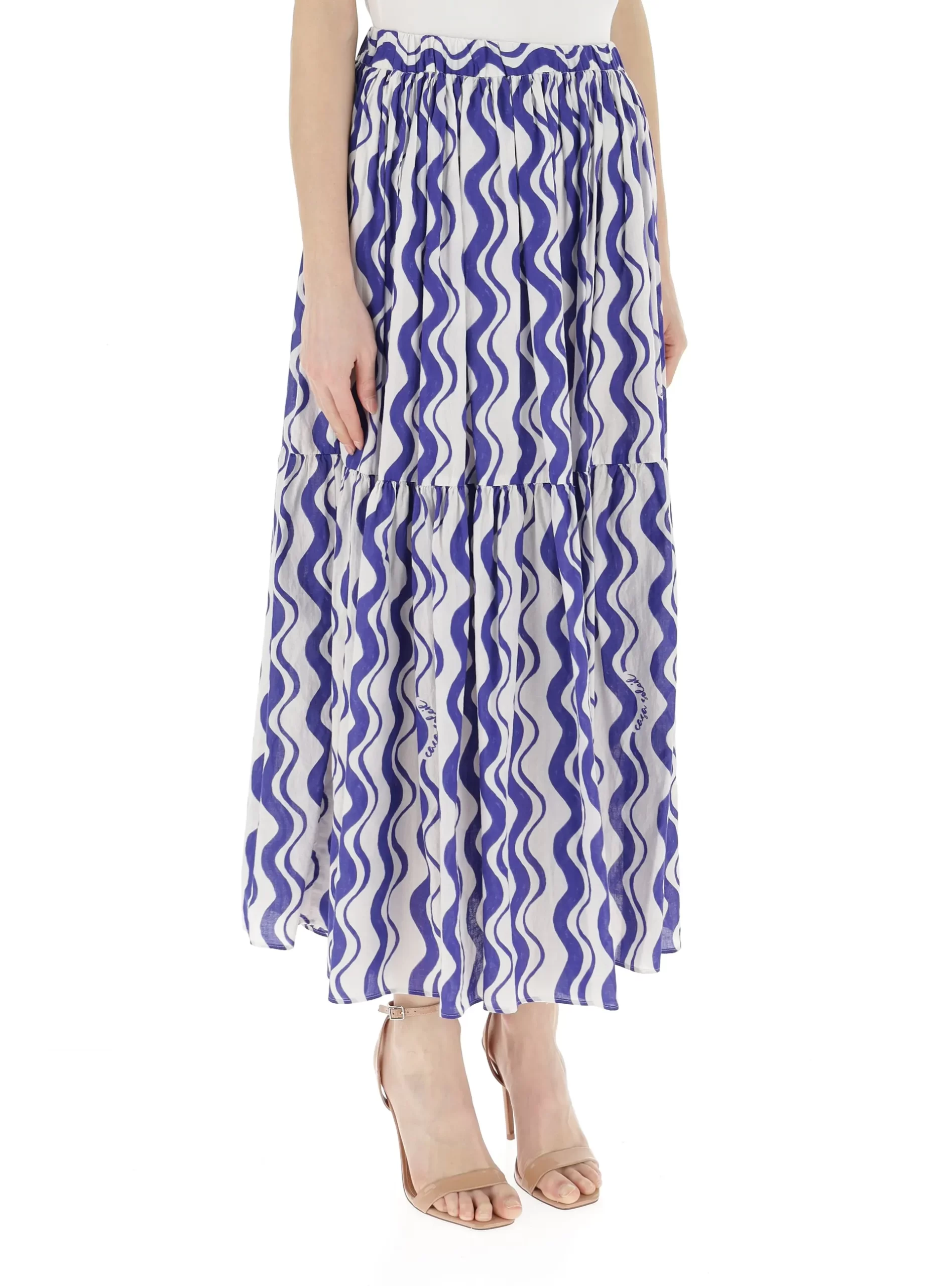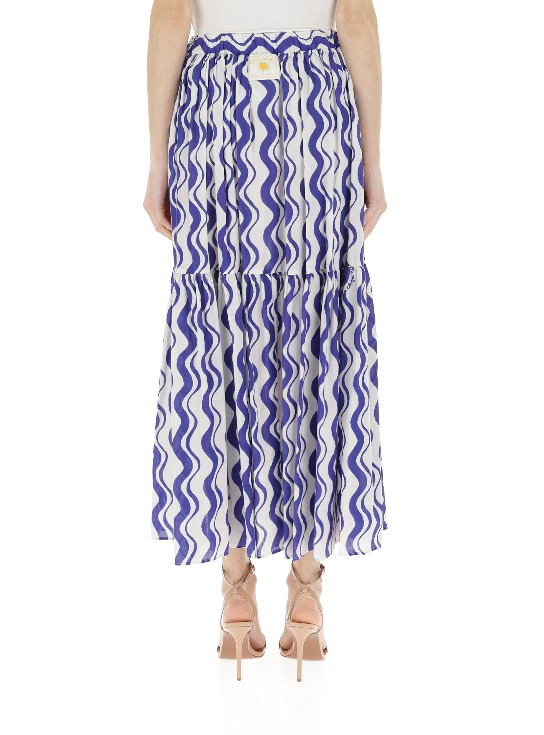 Gonna in cotone con balza sul fondo, fascia in vita elasticizzata, due tasche sui lati, etichetta logo cucita sul retro, fodera interna removibile, collezione Casa Soleil