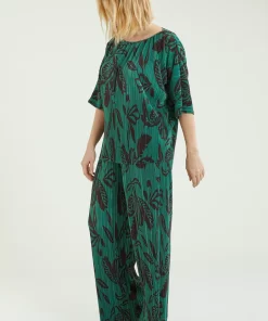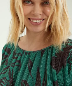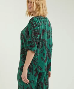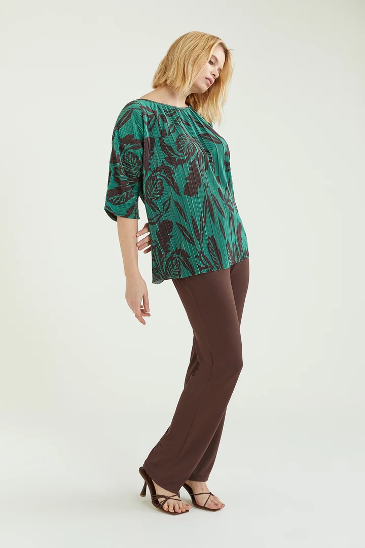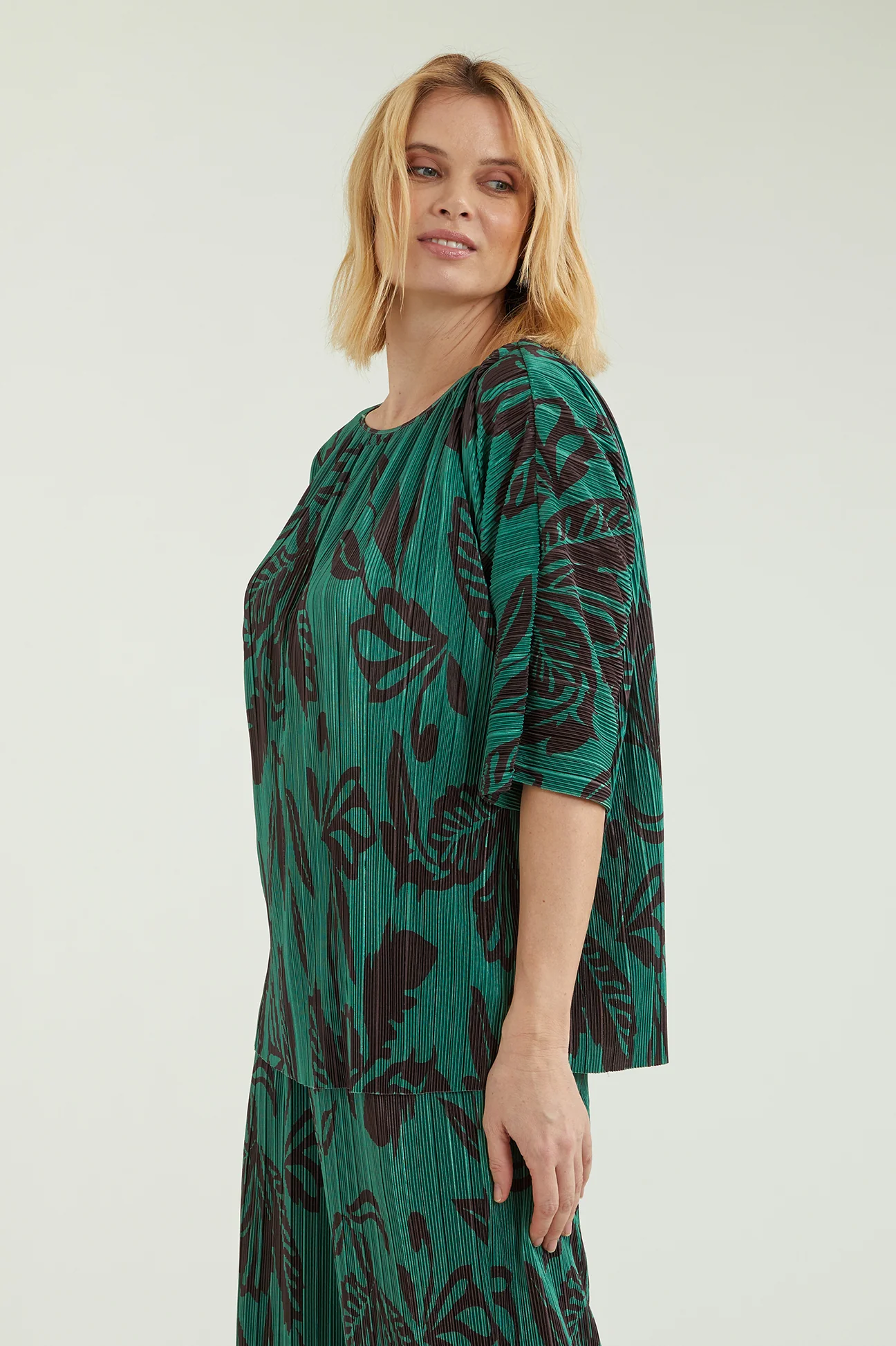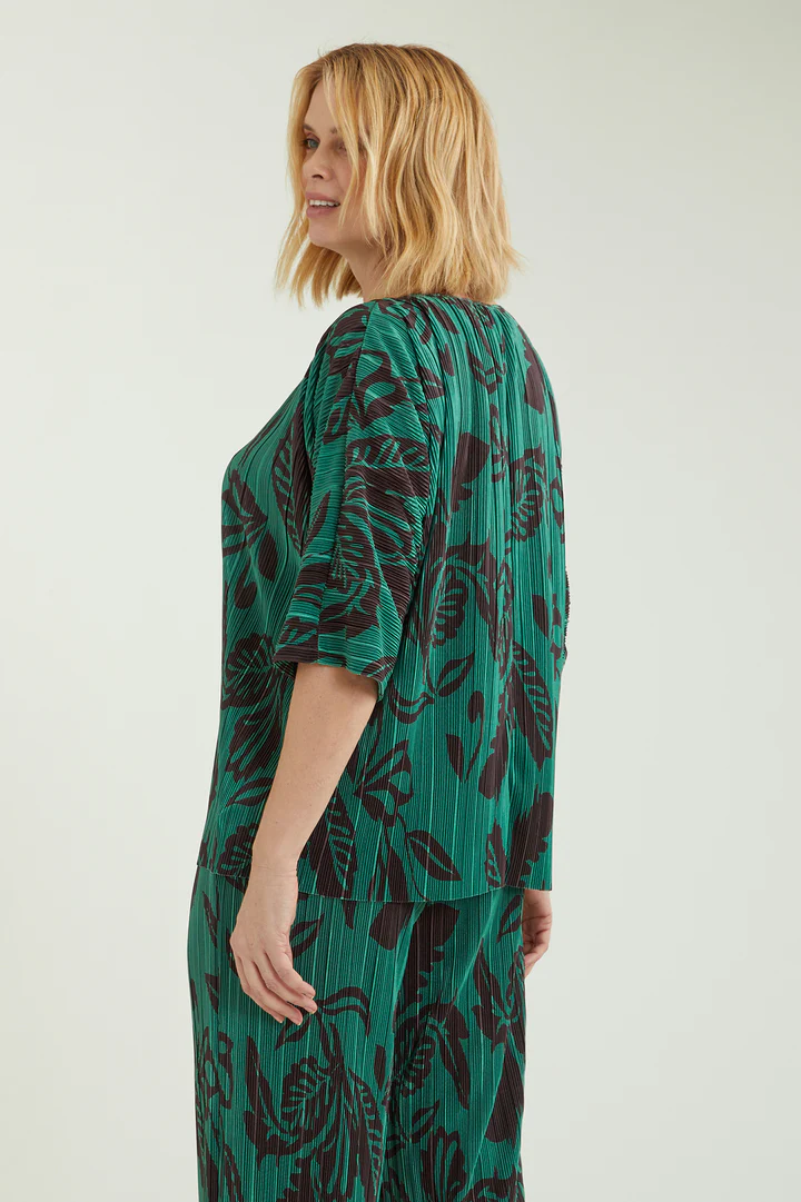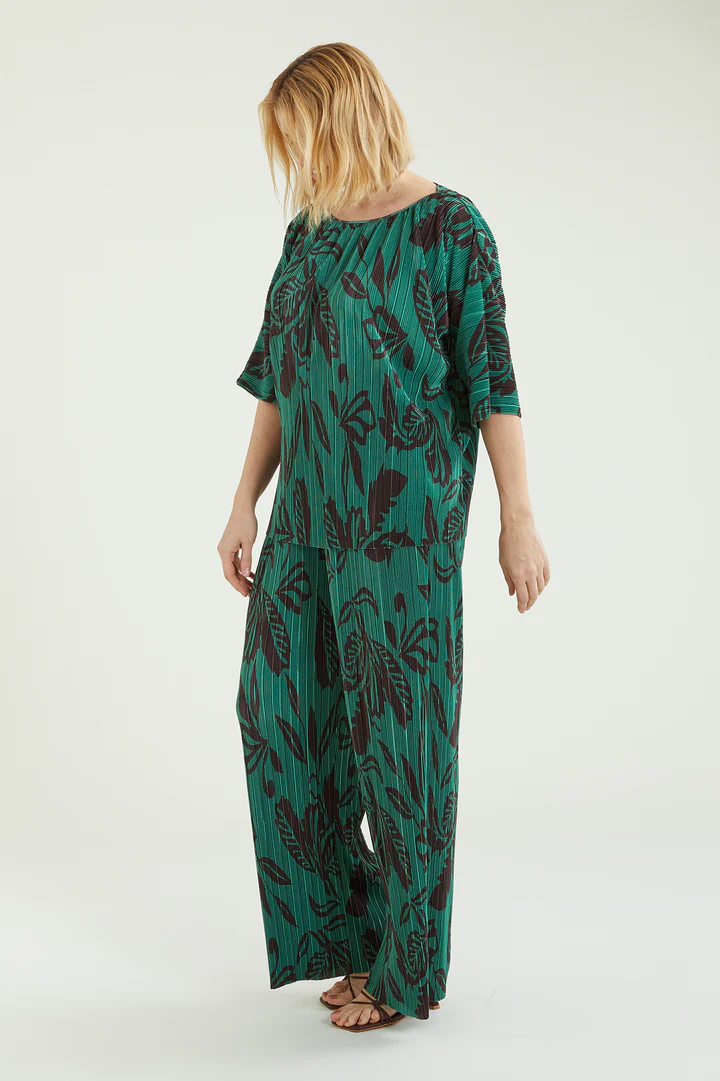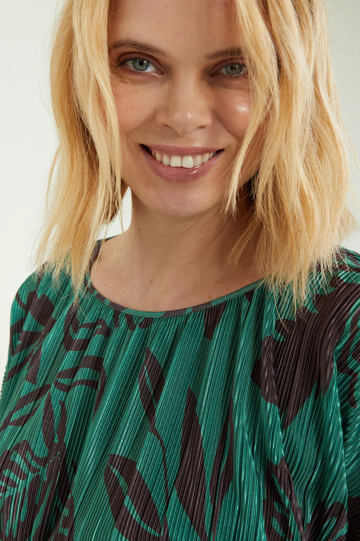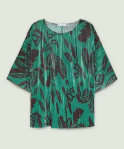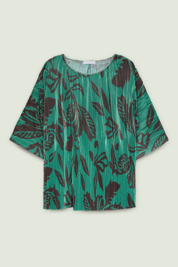Blusa dalla linea fluida realizzata in un tessuto estensibile caratterizzato da una micro plissettatura. Scollo a barchetta, taglio a chimono. Stampa esclusiva Luisa Viola.