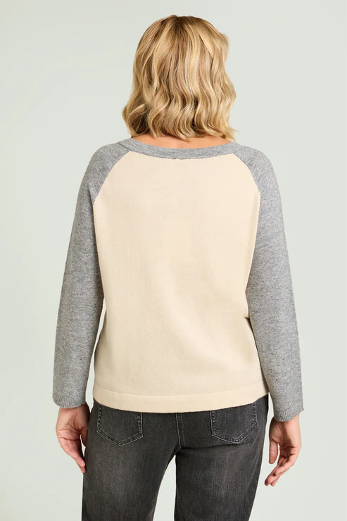 Maglia bicolor con scollo ricamato a mano. Filato mistocashmere, finezza 12, punto rasato con bordi in costa, taglio raglan con calature.