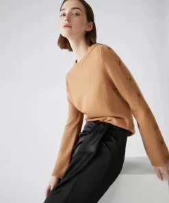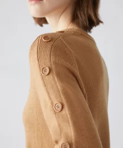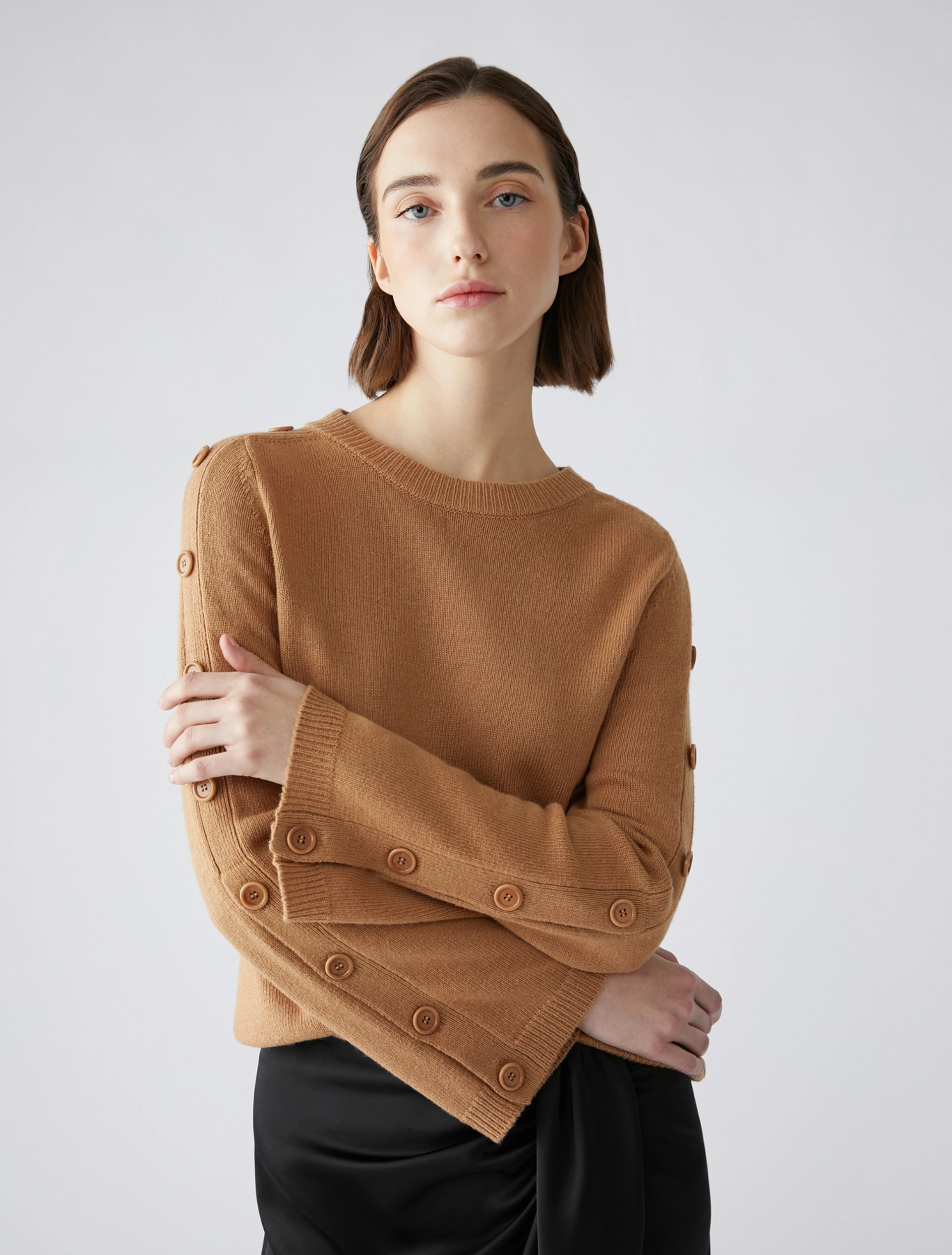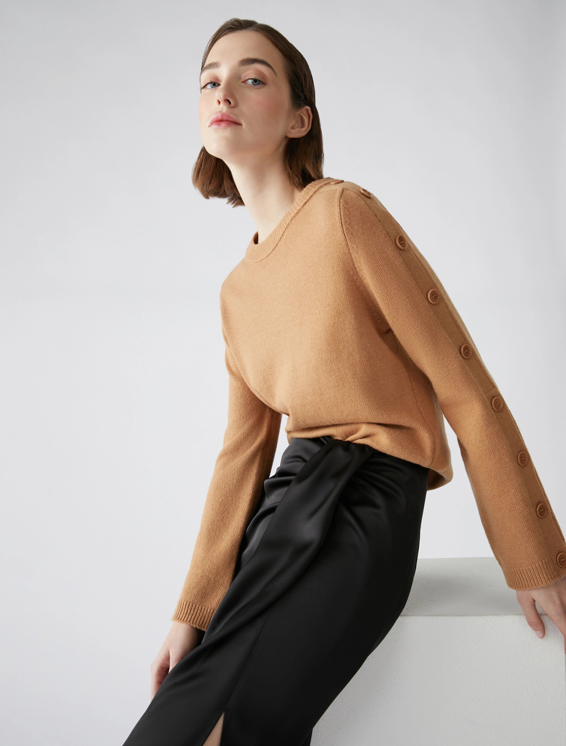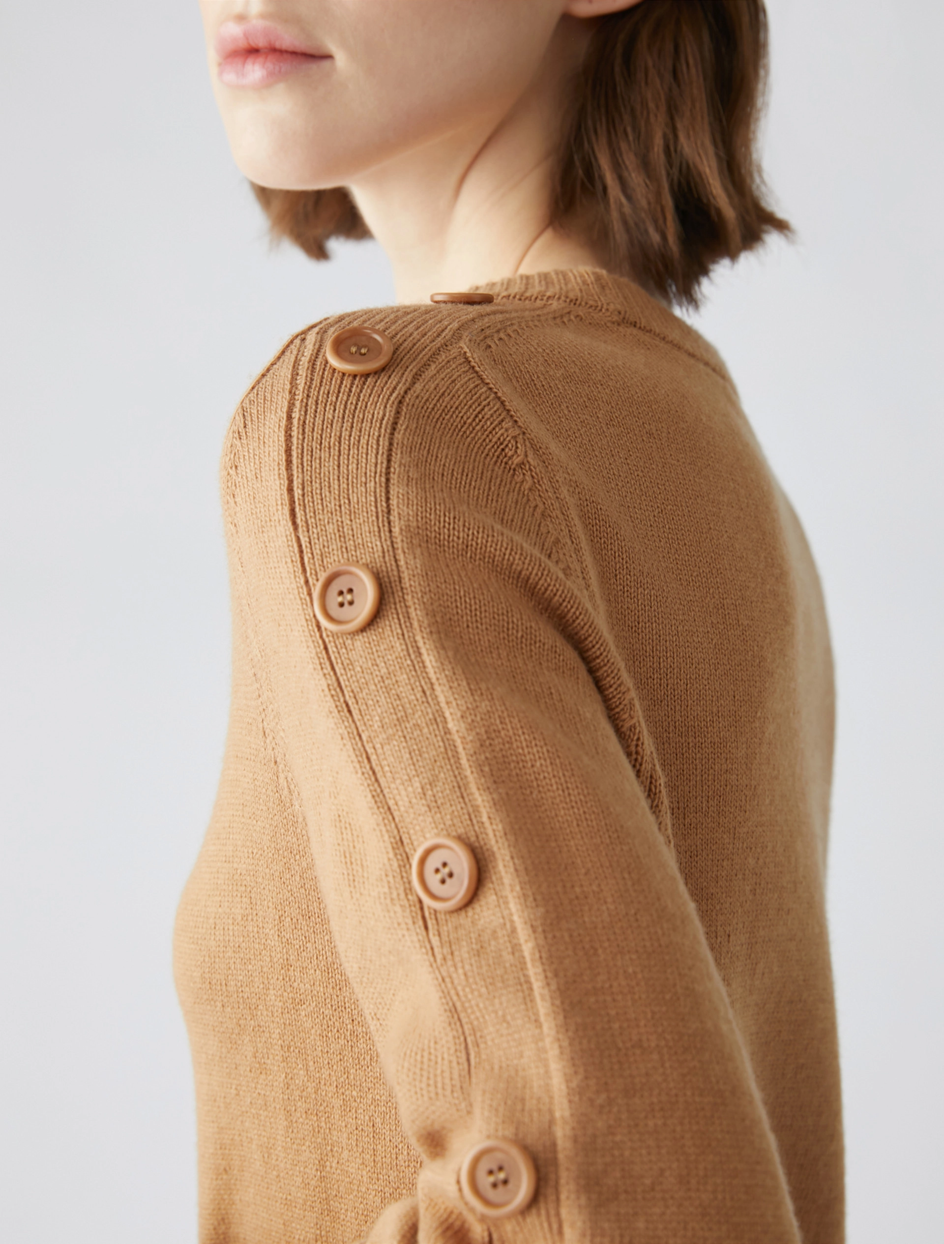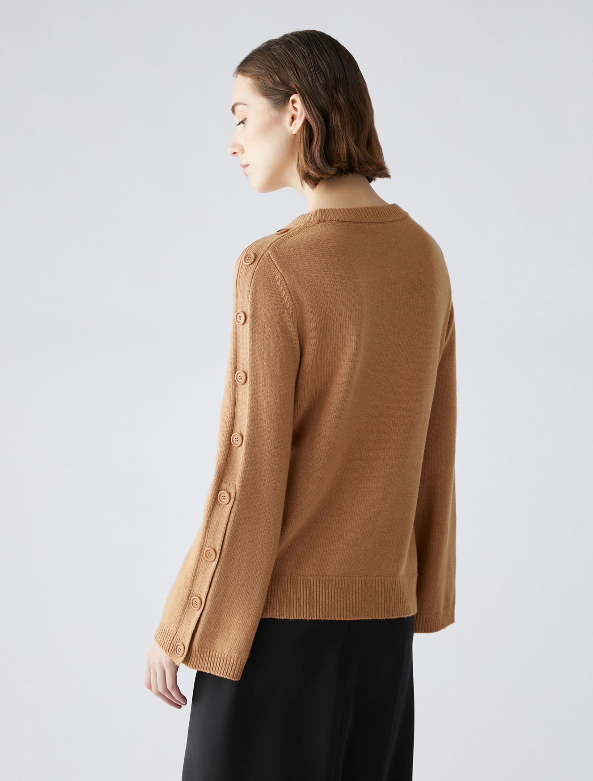 Maglia in blend di lana con un tocco di cashmere. Di taglio slim, ha le maniche leggermente svasate con bande a intarsio e bottoni, apribili dal gomito al polso. Scollo a barchetta arrotondato, lavorazione rasata con bordi a coste.