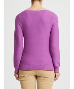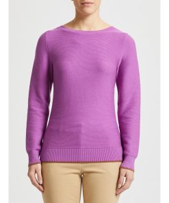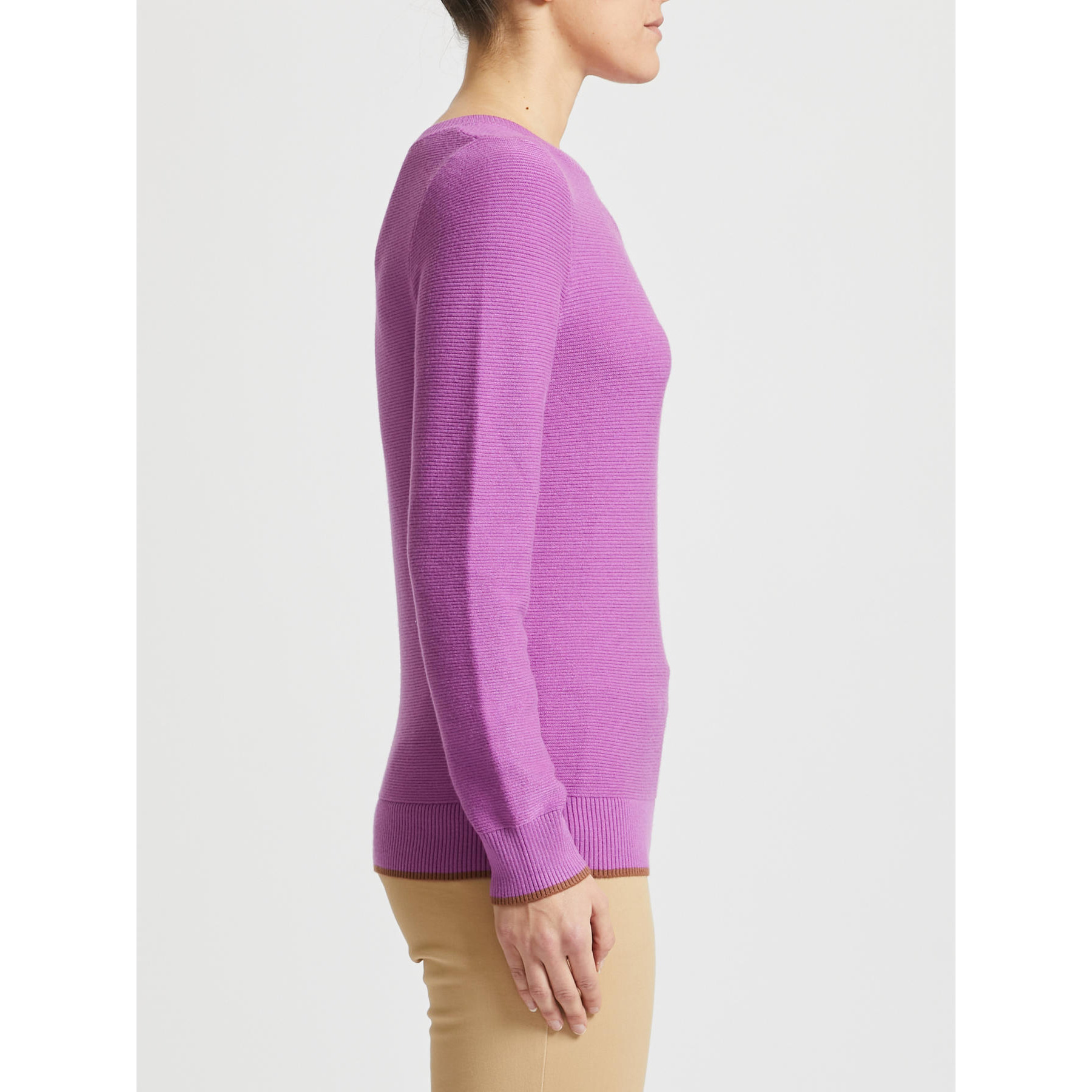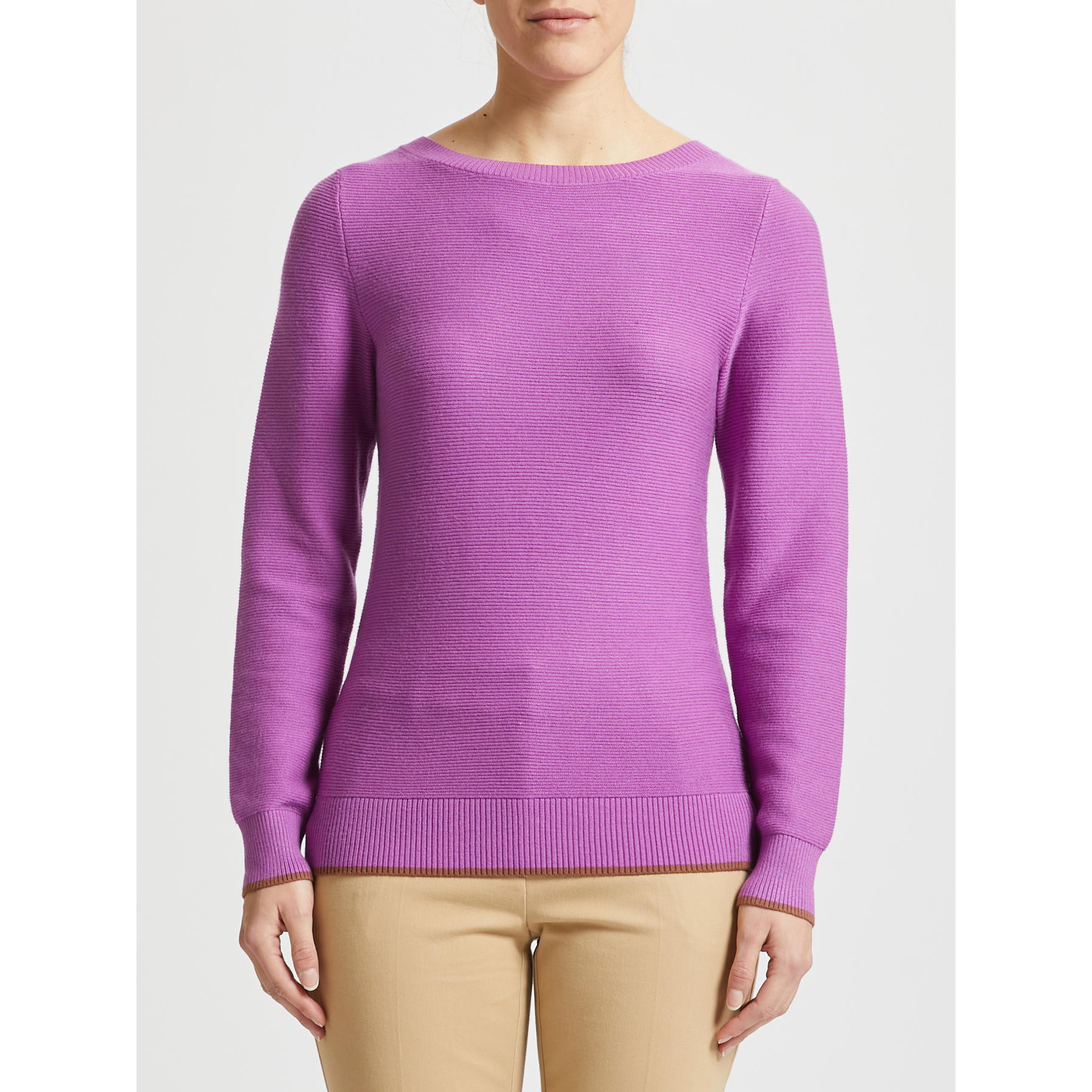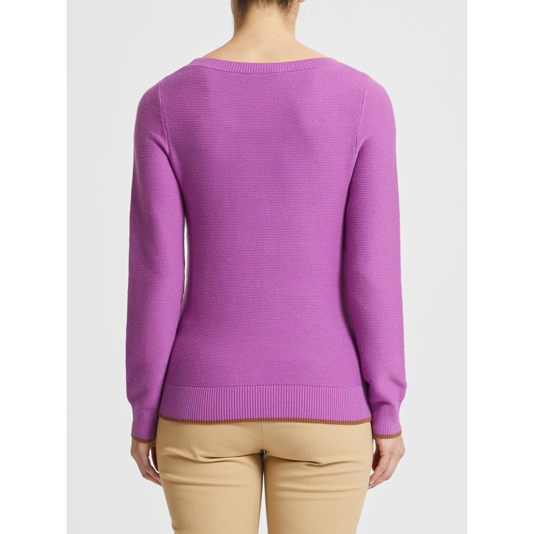 Maglia in tricot sottile, lavorata a punto 3D con l’effetto di micro-coste orizzontali. Scollo a barchetta e taglio slim, è rifinita con bordi a costine e profili in colore a contrasto. Passe-partout di mezza stagione.