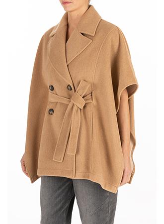 Mantella in velure di panno a coste trasversali, doppiopetto, con revers, passanti e cintura in vita.