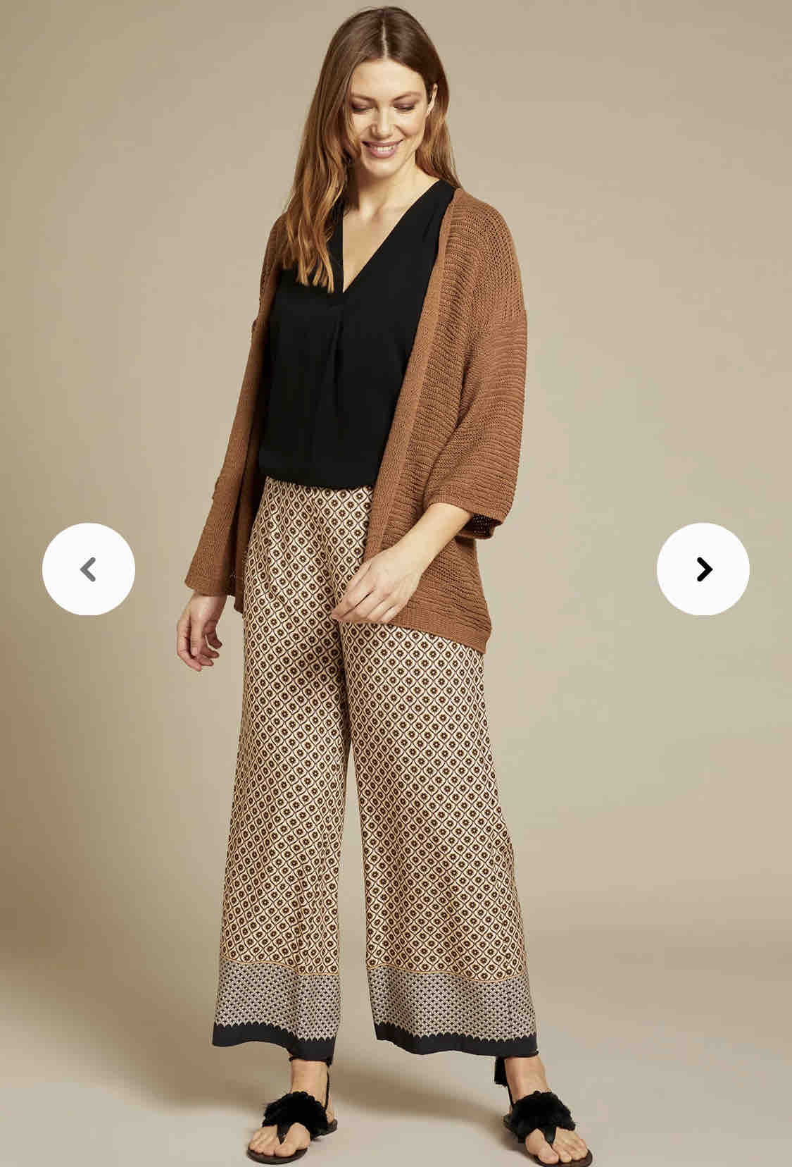 Una microfantasia dal mood etnico caratterizzata da un bordo in un secondo disegno, per un pantalone fluido facilmente abbinabile a capi neri, cacao e naturali. Un etnico sofisticato, una stampa esclusiva Luisa Viola.