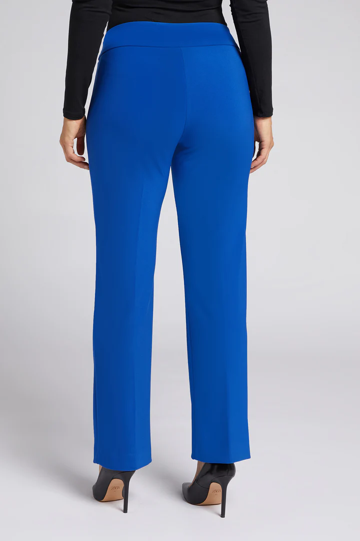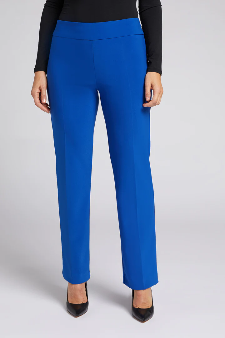 Pantaloni in tessuto compatto stretch “enver satin”, dalla linea ampia dritta, caratterizzato da un rovescio raso che dona una piacevole sensazione sulla pelle. Punto vita regolare, cintura elasticizzata, piega stirata.