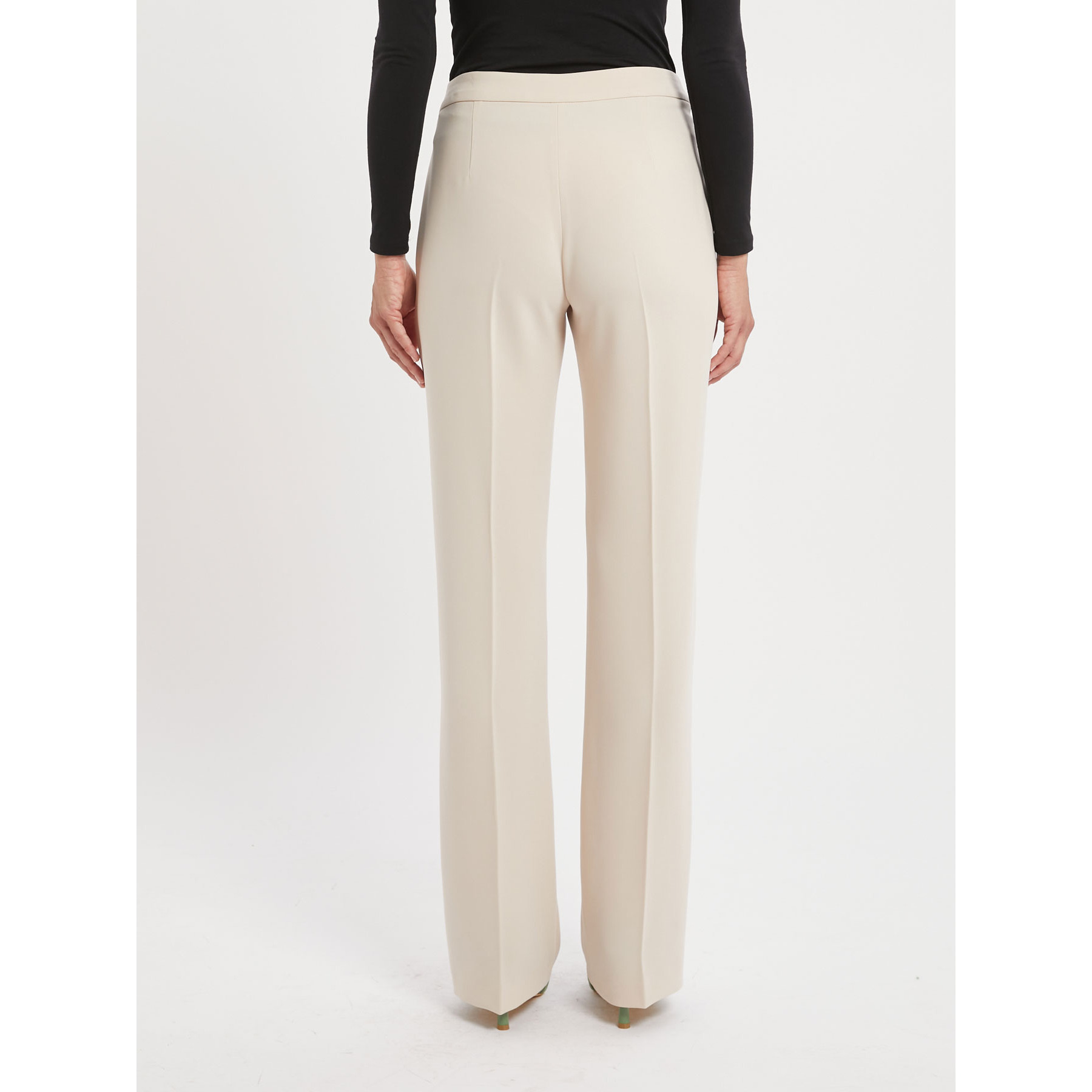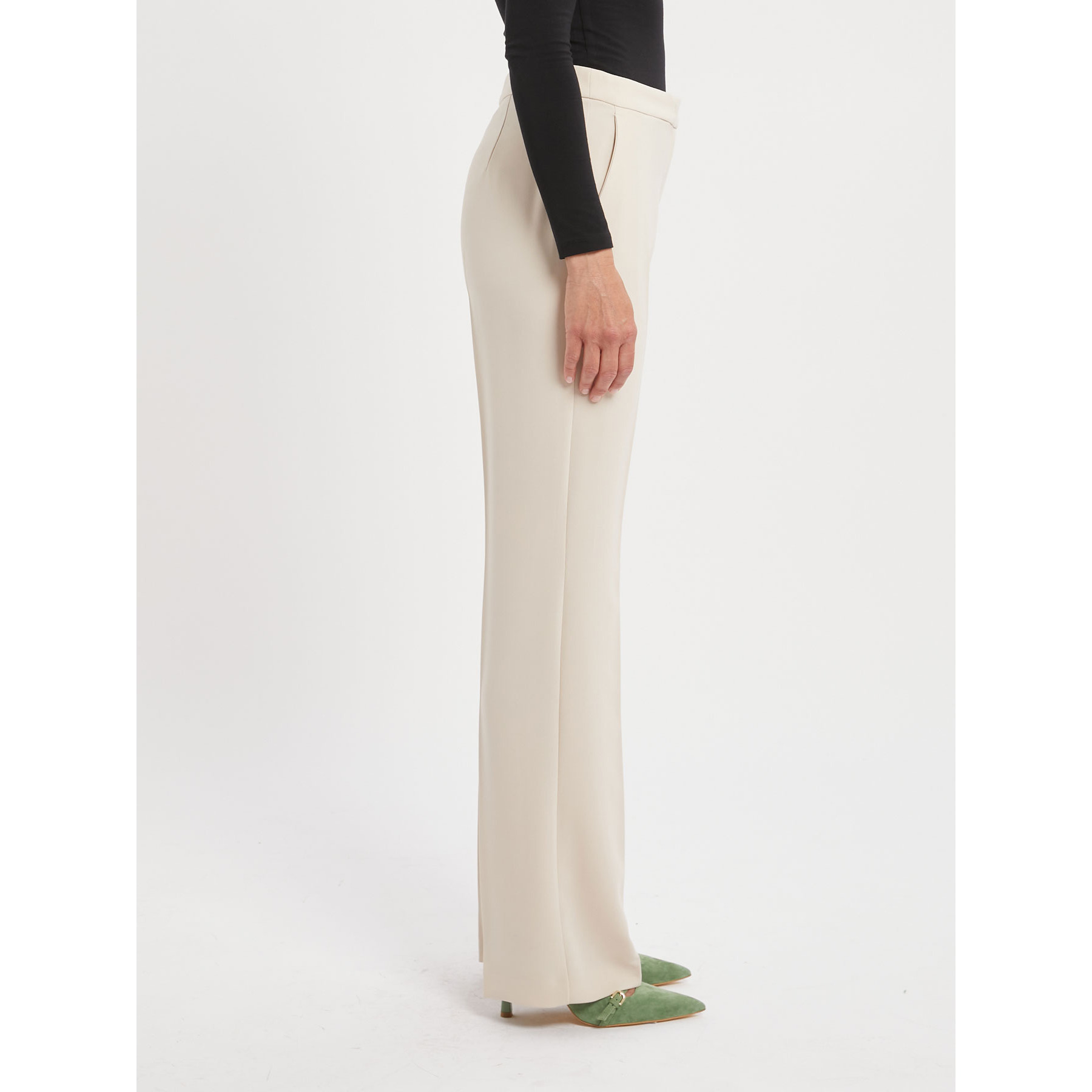 Pantaloni flair in cady bistretch con piega stirata al centro e tasche alla francese.