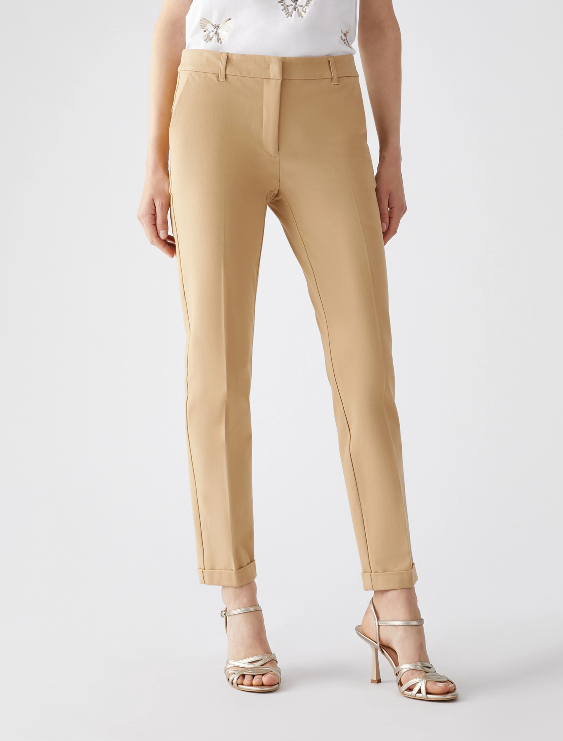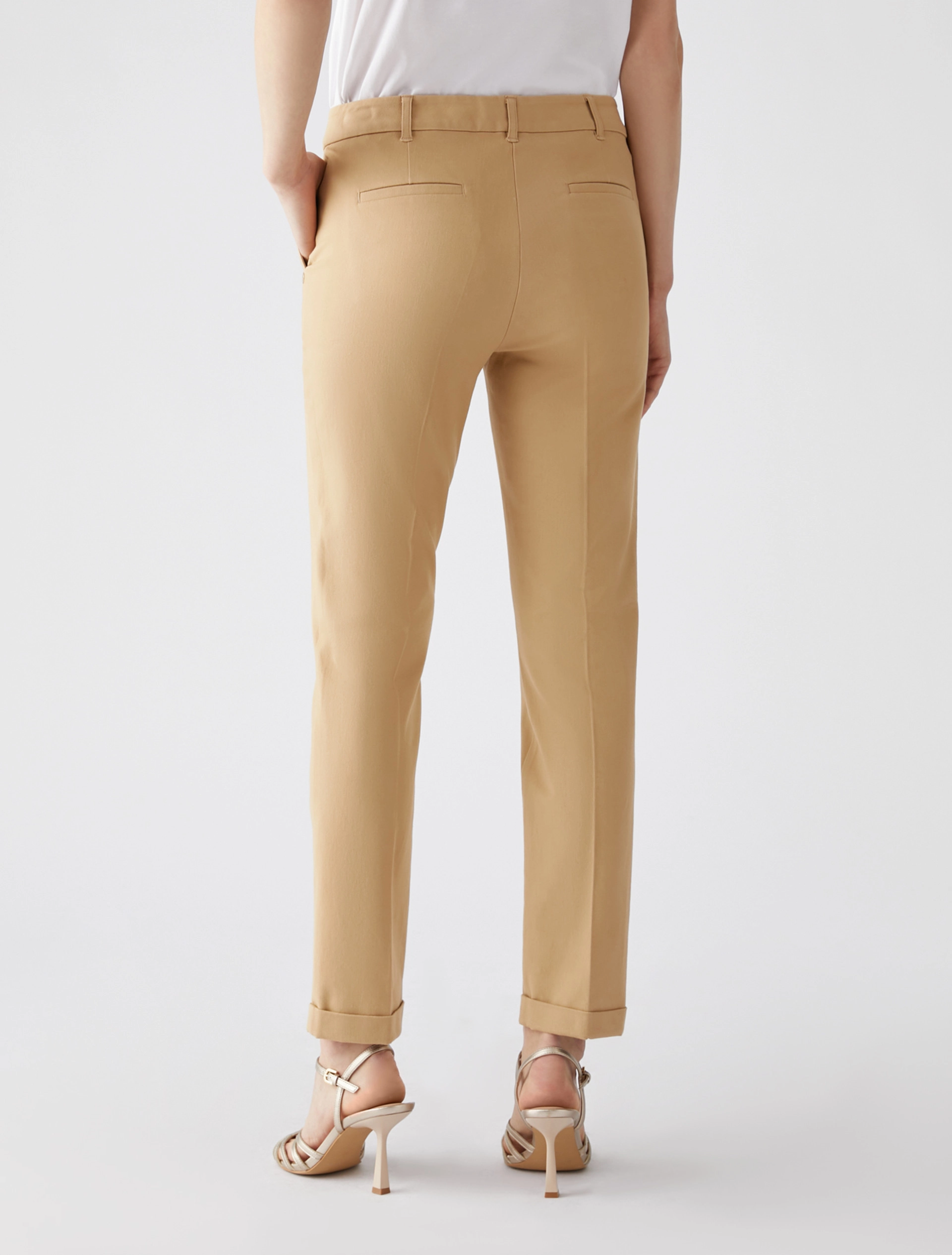 • Vita con passanti, gamba affusolata con piega stirata e risvolto al fondo.