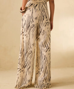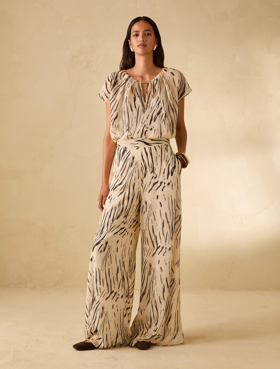 • Una ricercata elaborazione grafica di un grintoso motivo zebrato caratterizza questi pantaloni in georgette: eleganti, accompagnano il passo con maxi ampiezze mosse da spacchi.