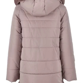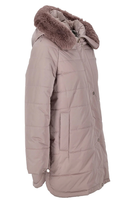 Piumino imbottito con cappuccio rifinito in pelliccia staccabile,leggermente sciancato chiusura con zip fino in alto da formare il cappucccio un collo avvolgente sciallato impreziosito dal morbido bordo in pelo. pattina sul davanti con bottoni a scomparsa clips.Tasche laterali ,
