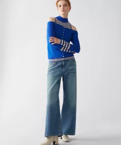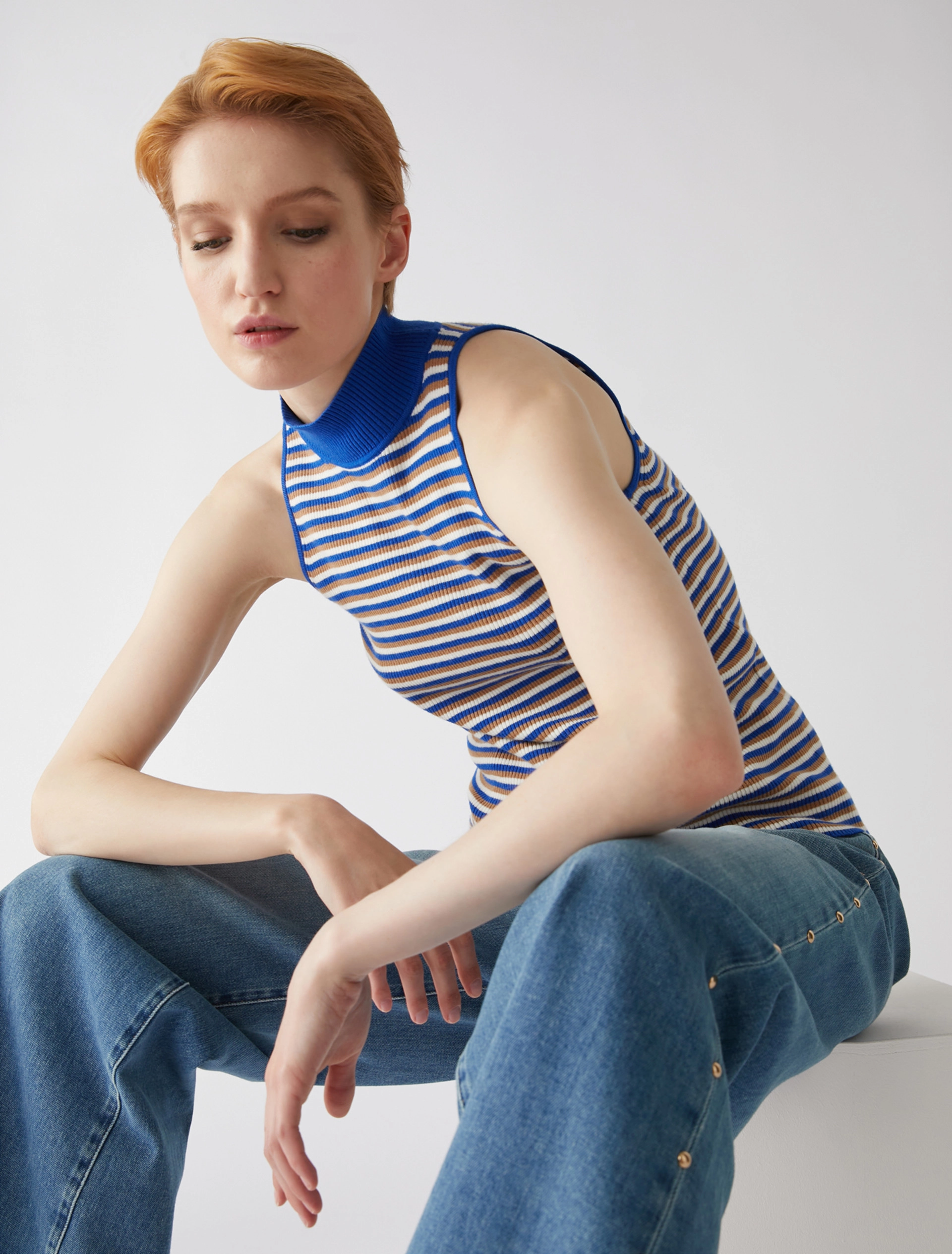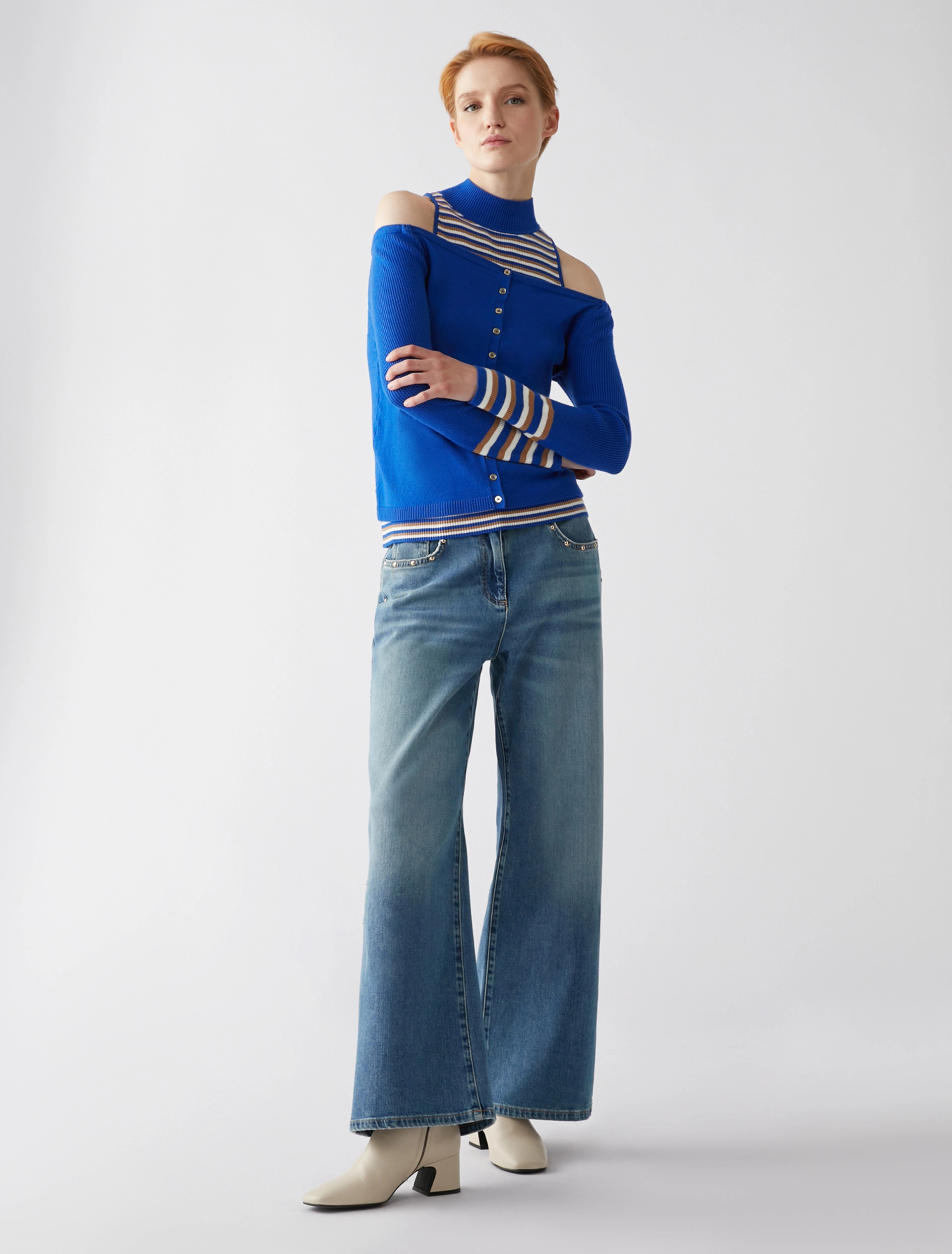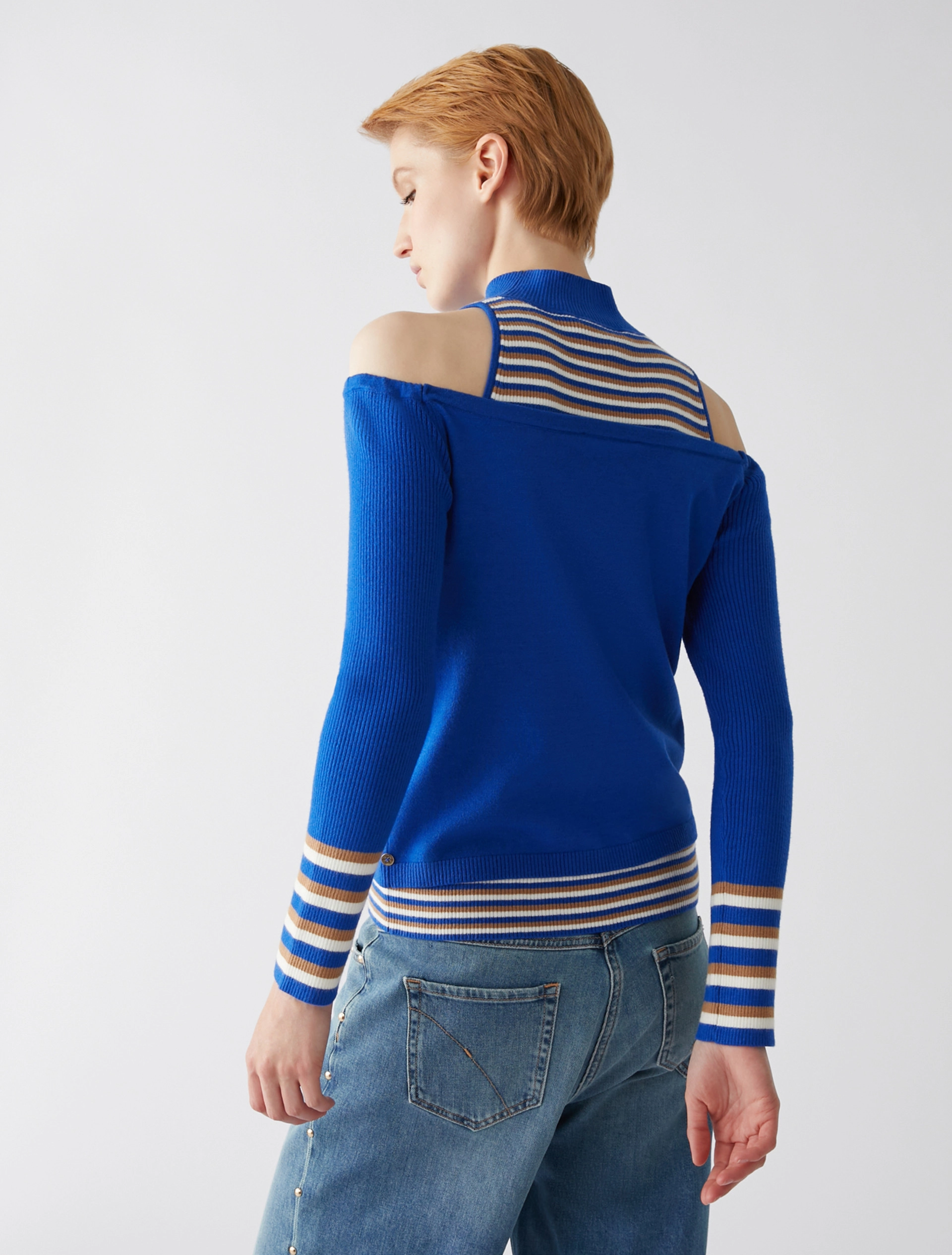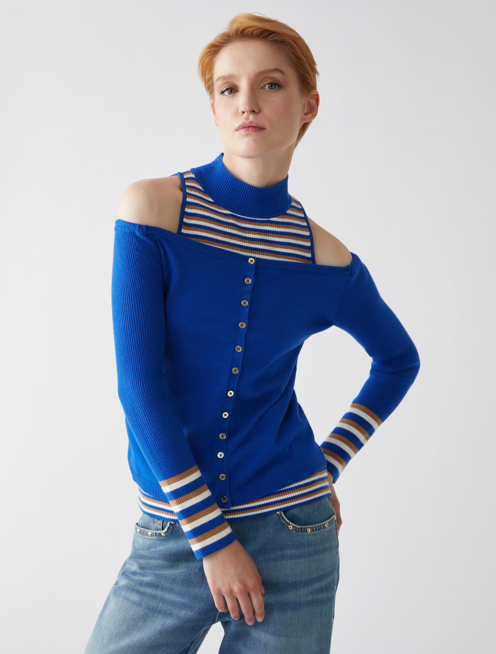 Proporzioni inedite per il twin set in maglia. Cardigan slim fit con scollatura che scopre le spalle, lavorazione rasata e maniche a costine con bordo a righe. Top aderente con collo a lupetto e spalle all’americana, interamente lavorato a righe e costine.